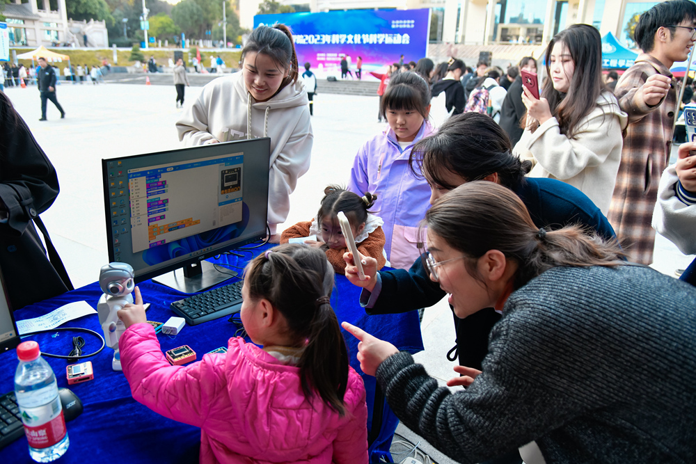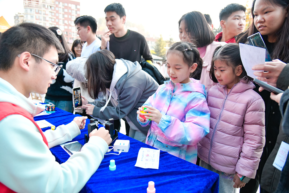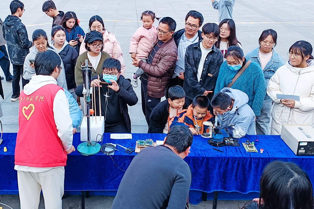 物理与电子工程学院院长王绍明在开幕式上介绍科学运动会筹备情况,以及运动会项目设置、参与流程等安排。物电学院13名教师和50名学生担任志愿者,引导大家参与体验,讲解相关科普知识。