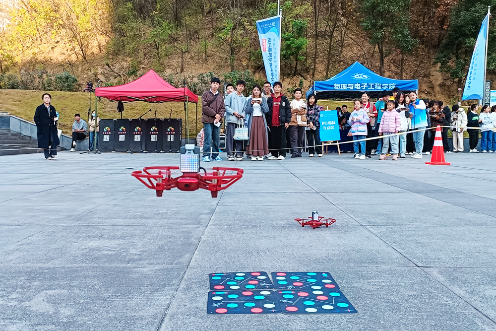 活动现场一共设置了10个互动体验区,包括VR眼镜、美丽科学虚拟互动展示、机器人整队表演、微小芯片互动模块、飞行器编队表演、水火箭制作发射、航拍表演、太阳系及卫星绕月轨迹展示、航天视频、机器人投篮比赛等。现场还展出了物理与电子工程学院近三年来学生参加各种学科竞赛的优秀作品及成果。根据活动规则,参与者每完成一个项目就可获得1个印章,集够6个以上的印章可以在现场兑换创新创业积分。