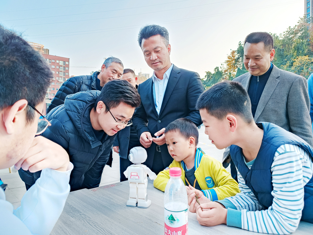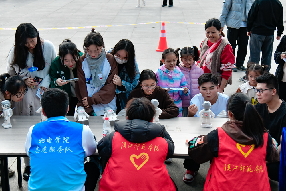 “悟空!悟空!打个太极!”“悟空!悟空!跳个舞吧!”12月9日下午,在冬日暖阳照耀下的汉江师范学院校前广场,一群大朋友、小朋友挤在机器人整队表演区的桌子前,兴奋地喊着各种指令。伴随着指令,一排可爱的小机器人扭动腰肢,或打起太极,或做着俯卧撑,或表演舞蹈,惟妙惟肖的动作引得围观众人惊叹不已。