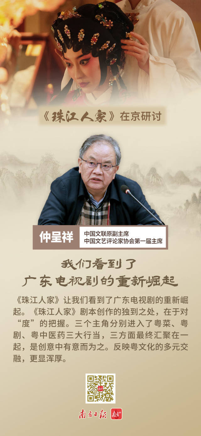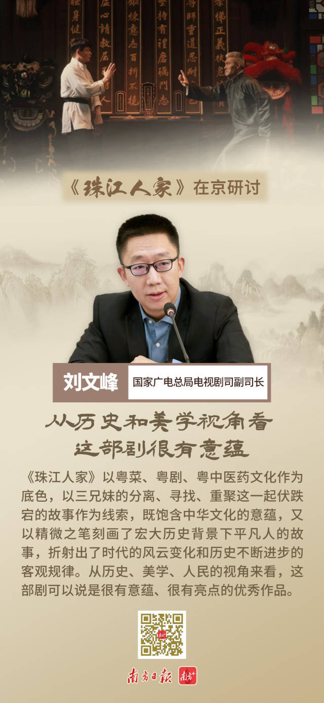 “《珠江人家》是一部具有全国影响力的粤派剧集,过硬的文学剧本,风格鲜明的影像语言,云集实力派青年演员和老戏骨,以通俗化、传统化的历史表达,达成地域圈层的突破,形成雅俗共赏、老少咸宜的传播效果,在全国荧屏掀起一股久违的沁人心脾的南粤风潮。”