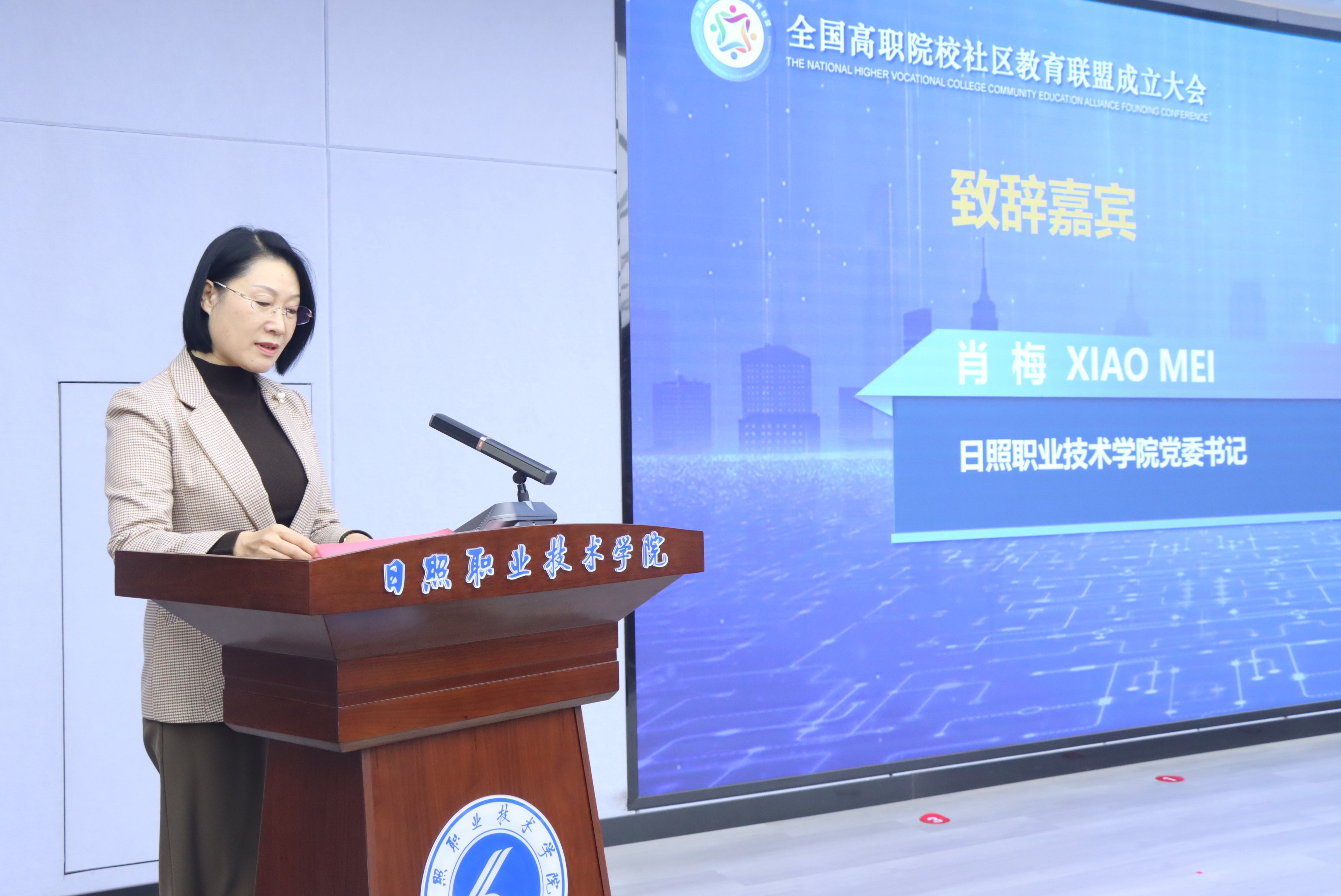 肖梅致辞,她介绍了学校基本办学情况和社区教育工作取得的成效。她表示,组建全国高职院校社区教育联盟,是整合集聚社区教育优质资源,提升高职院校社区教育服务能力的重要举措,对构建国家终身教育体系和推进学习型社会建设起着至关重要的作用。联盟成立大会在日照职业技术学院召开,是民政部中国社区发展协会、山东省社区教育指导服务中心及全国各高职院校对学校的信任和支持,学校将以联盟建设为契机,秉持“合作、交流、共享、共赢”的理念,与全国各高职院校共同打造职业院校服务社区教育的合作交流平台,共同探讨职业教育服务社区教育的实践模式和推进路径,推动职业院校服务社区教育工作高质量发展。