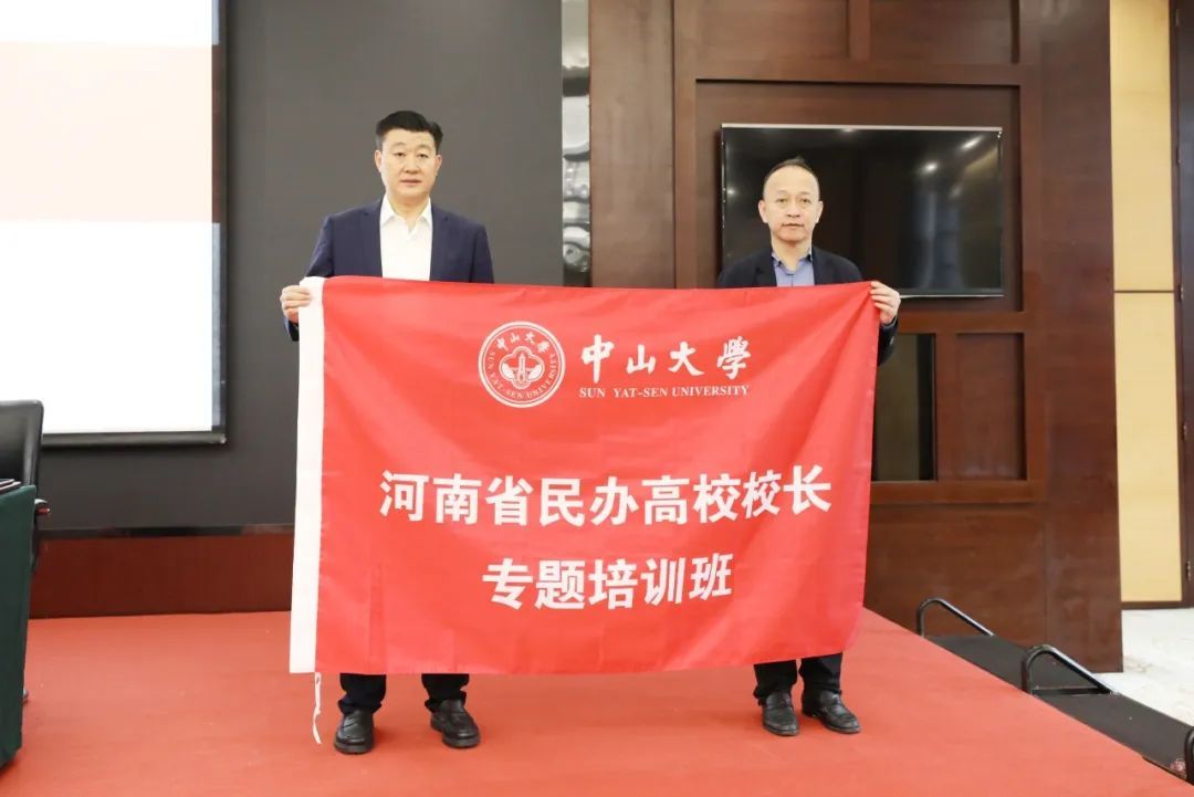 中山大学继续教育学院院长杨元红为培训班授旗,郑州商学院校长吴泽强作为学员代表接旗。