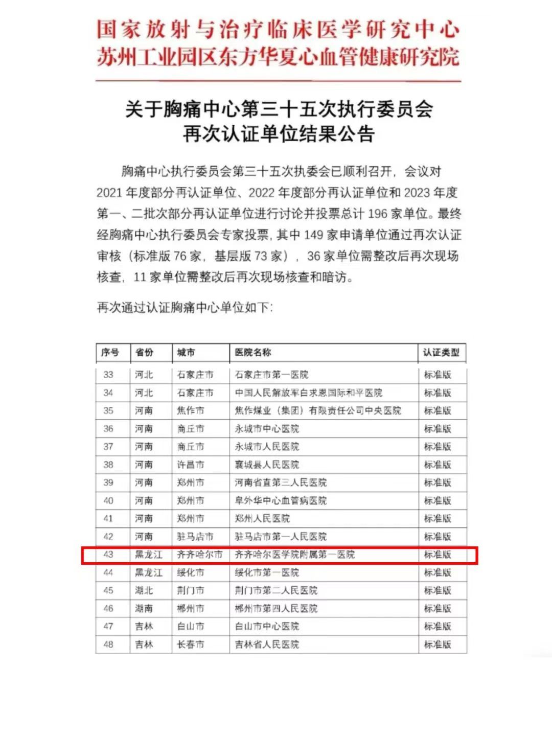 近日,2023年心血管健康大会在北京举行,齐齐哈尔医学院附属第一医院通过了国家标准版胸痛中心再认证,并接受国家胸痛中心授牌。
