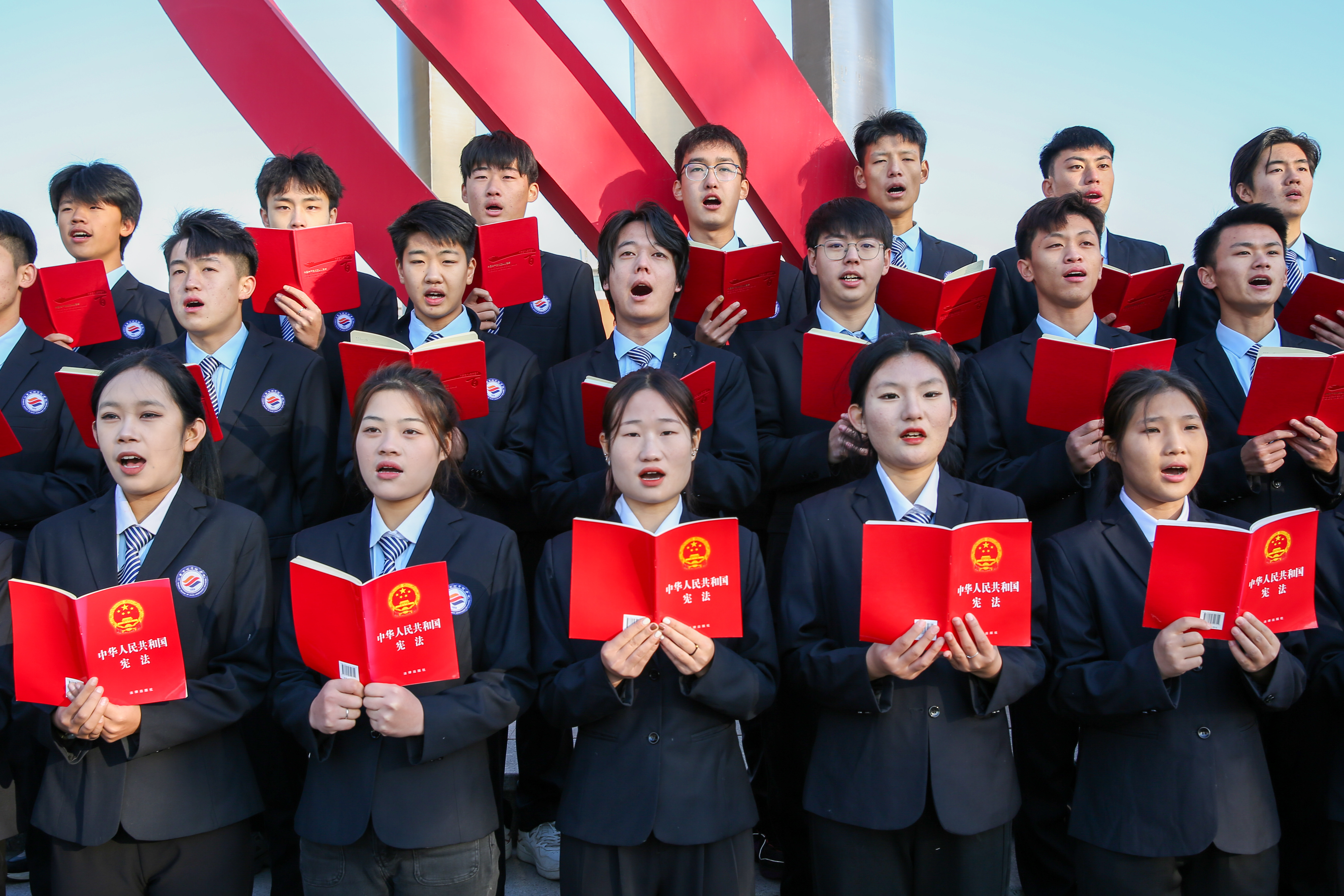 2023年12月1日,山东水利技师学院的学生们正在晨读宪法。