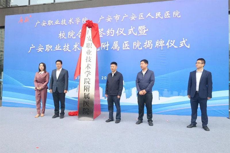 随后,双方签订了《院校合作协议》,广安职业技术学院党委副书记、校长王义全,广安区人民政府副区长杨东南,区卫生健康局党组书记、局长刘志军等领导共同为“广安职业技术学院附属医院”揭牌。