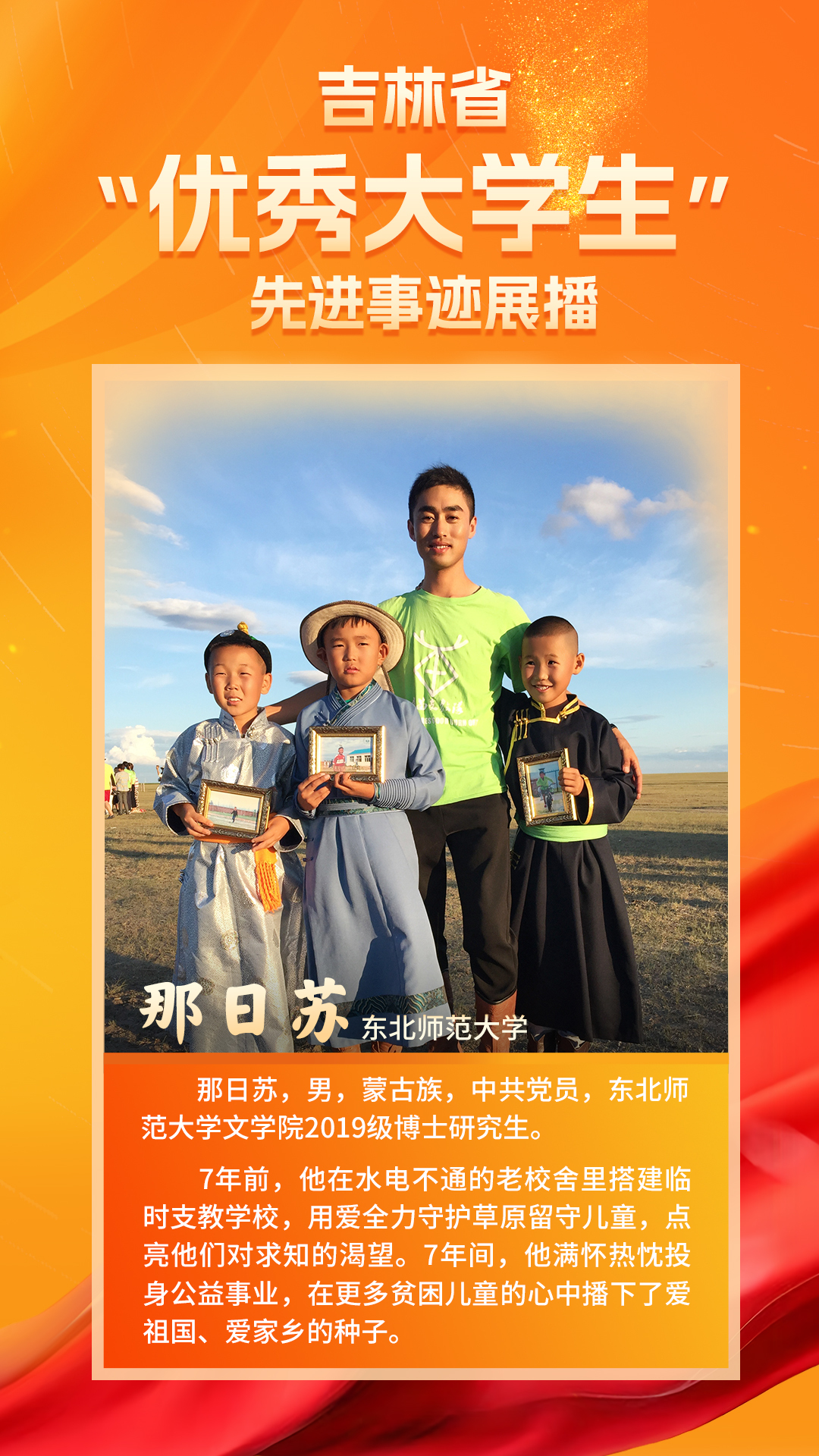 那日苏,男,蒙古族,中共党员,东北师范大学文学院2019级文艺学专业博士研究生。东北师范大学思政课学生讲师团成员,曾获“全国大学生‘讲好中国故事’创意传播大赛一等奖”“吉林省优秀大学生”等多项荣誉。他的支教故事被拍摄为专题纪录片,被中央电视台等多家媒体宣传报道。