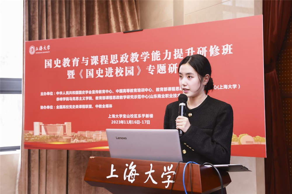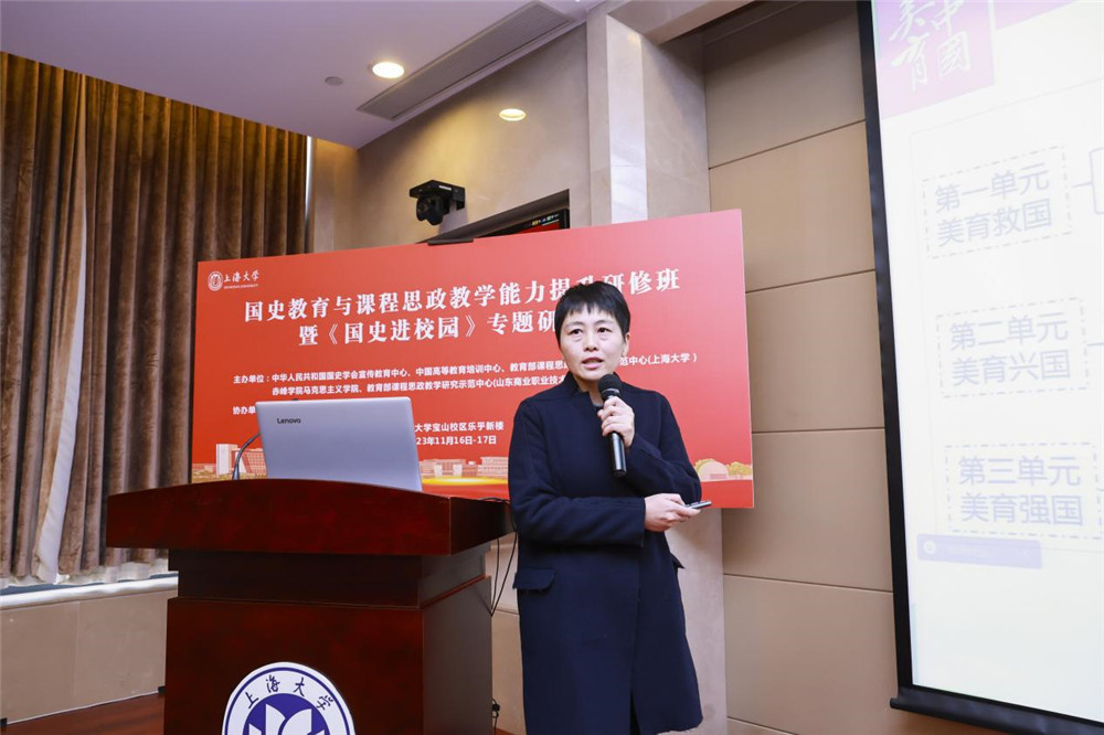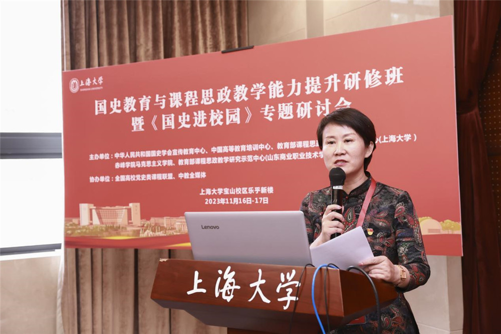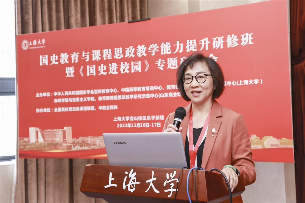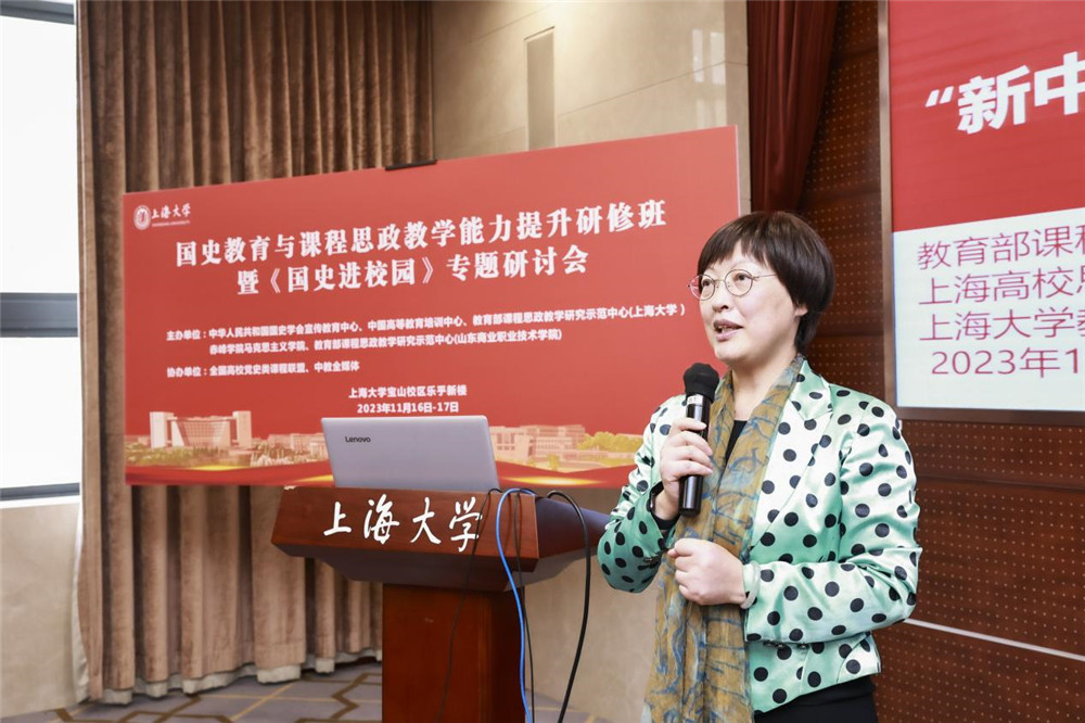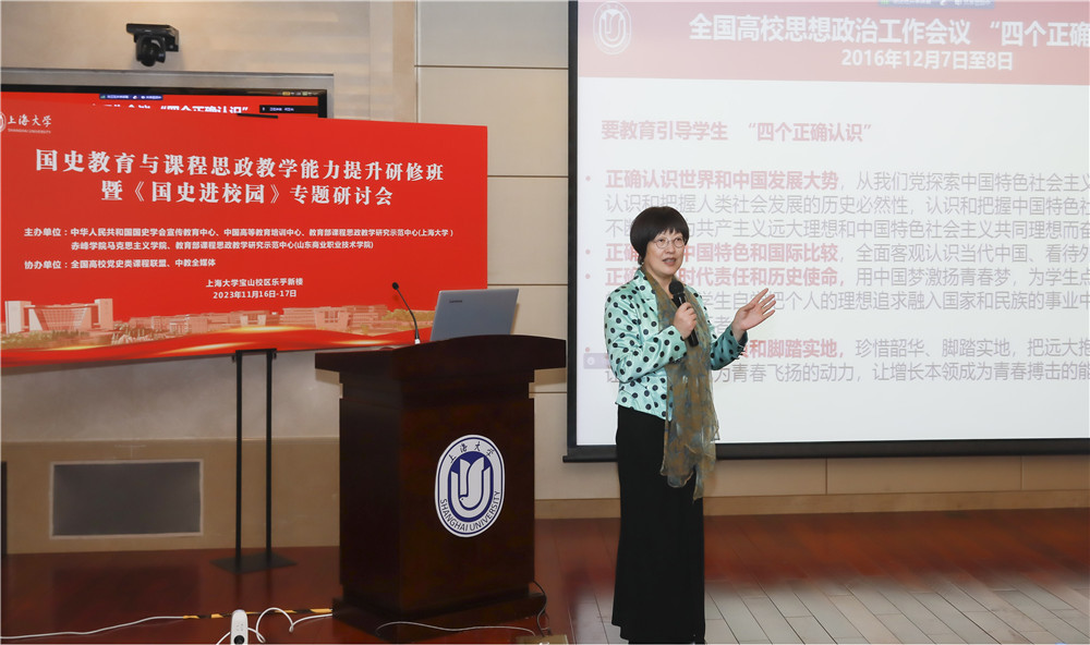 在国史教育与课程思政教学能力提升研修环节,顾晓英以“遵循爱国主义教育法‘新中国史’融入,促进课程思政高质量建设”为题作了报告。在课程思政建设过程中,由点及线到面,推动上海大学课程思政高质量建设,开发“一学科一课”系列课程,做好大思政课建设,完善“本-研-继教”全链条,联手基础教育,建设大中小思政一体化机制,开展“国家-市-学校”三级名师覆盖的培训,扩大全国党史类课程联盟;擦亮思政品牌,加强宣传推广,扩大影响力;围绕思政工作精品项目、网站建设、著作出版等建好课程思政教学研究示范中心。