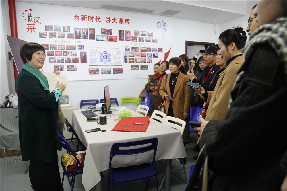 在上海高校思政课名师工作室——“顾晓英工作室”,教育部课程思政教学研究示范中心(上海大学),会议代表进行了“有温度、有深度”的体验和交流。2007年上海大学率先开展思政课“项链模式”教学创新,2014年又首创“大国方略”通识课;同年12月,时任中宣部副部长王世明来到上海大学听课,充分肯定了“大国方略”课程的开设意义、课程内容和教学模式。目前,学校已形成“一学科一课”系列课程20余门,形成了“开大课、传大道、讲大势”的优秀成果。工作室发起全国高校党史类课程联盟,深入开展国史进校园(红色经典进校园)活动,凝聚更多高校教师,遵循爱国主义教育法,推进“五史”与课程深度融合。