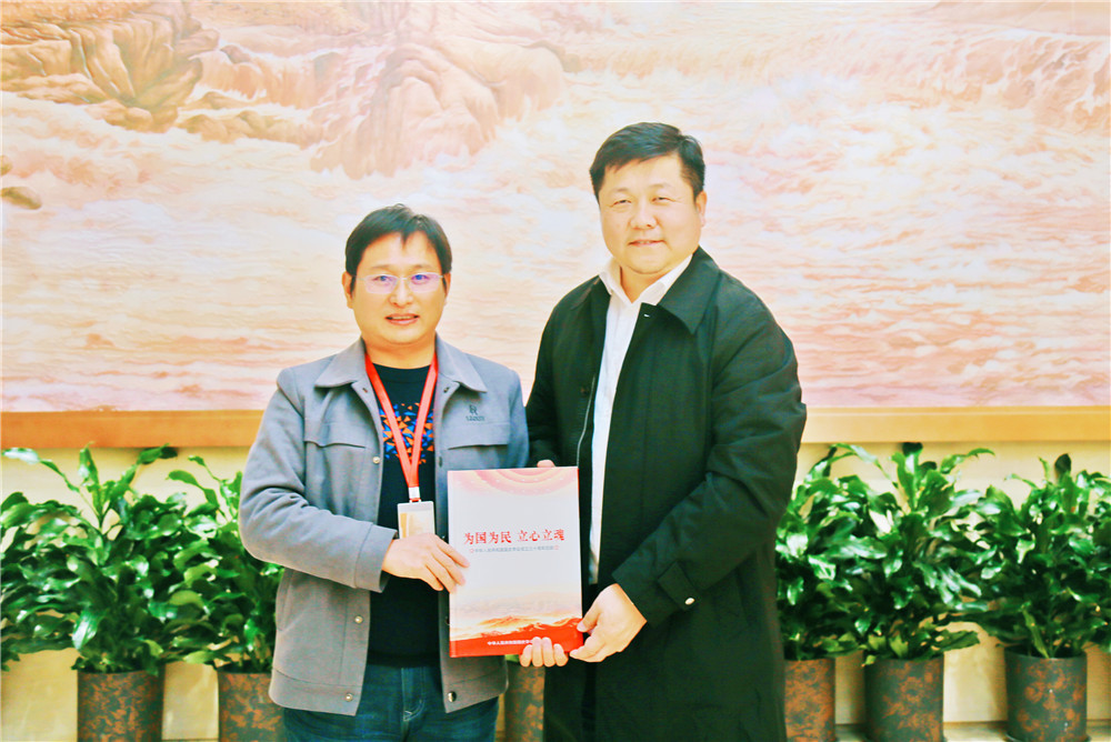 刘雨昕向中共一大纪念馆副研究馆员王长流赠送国史学会画册