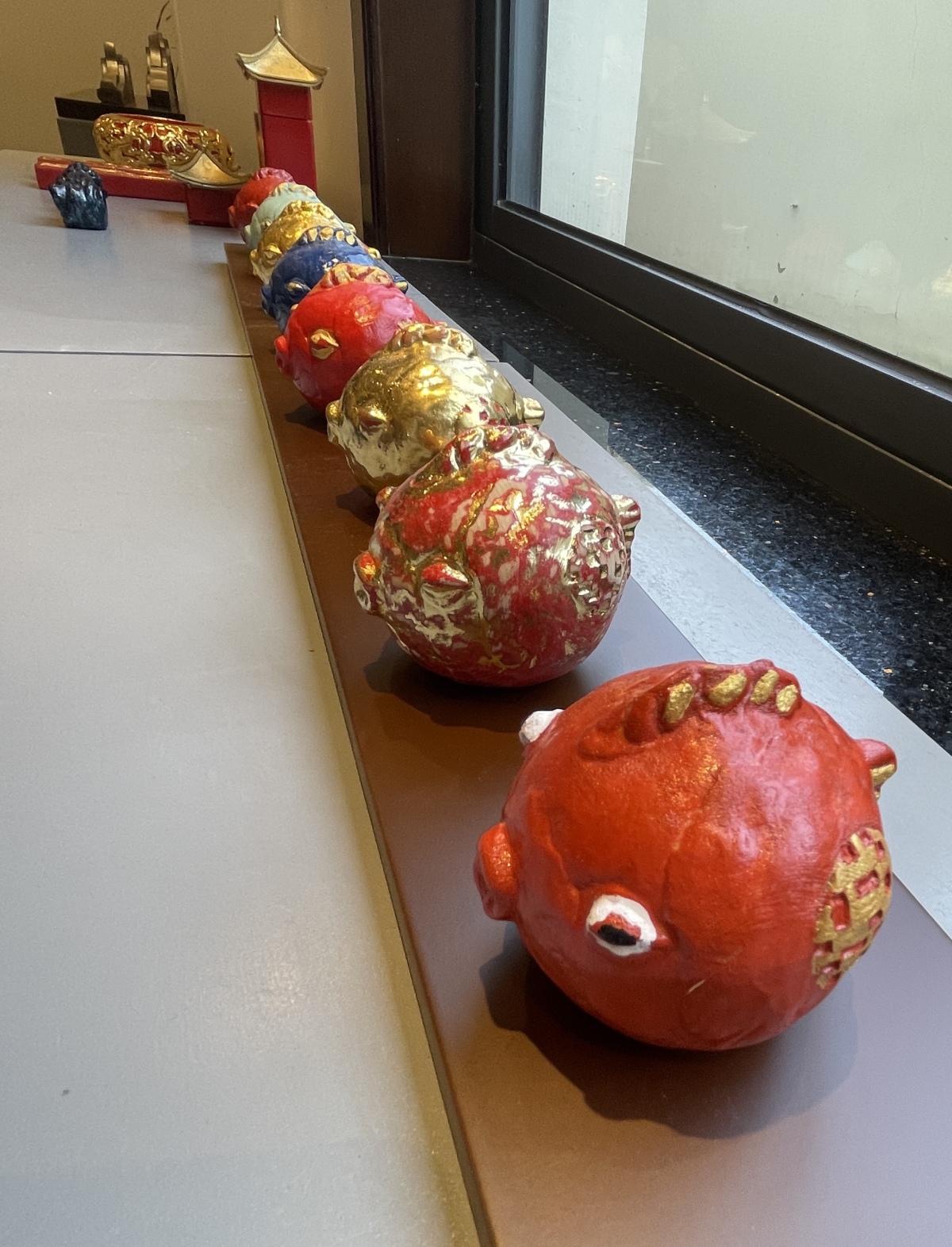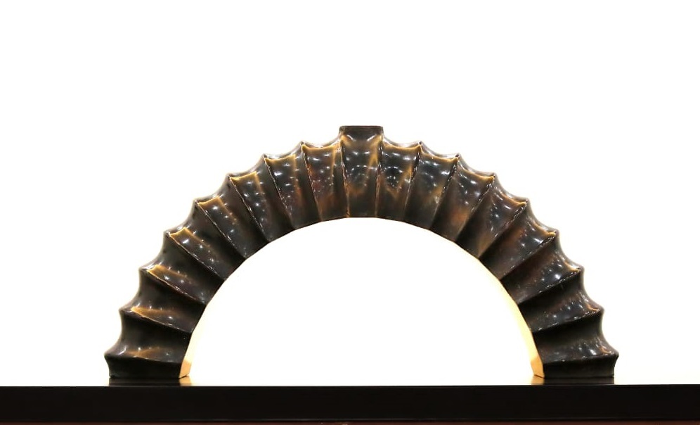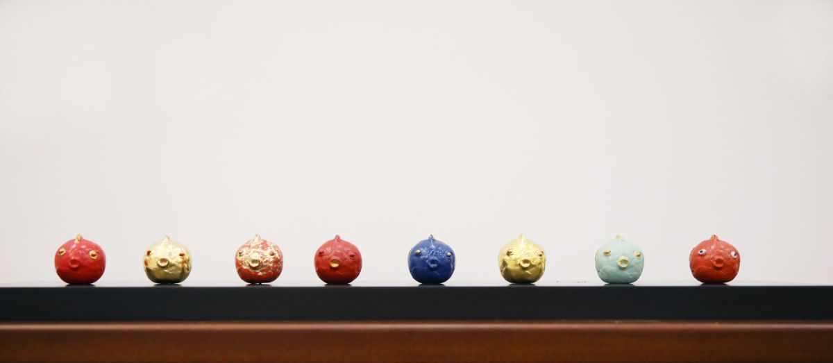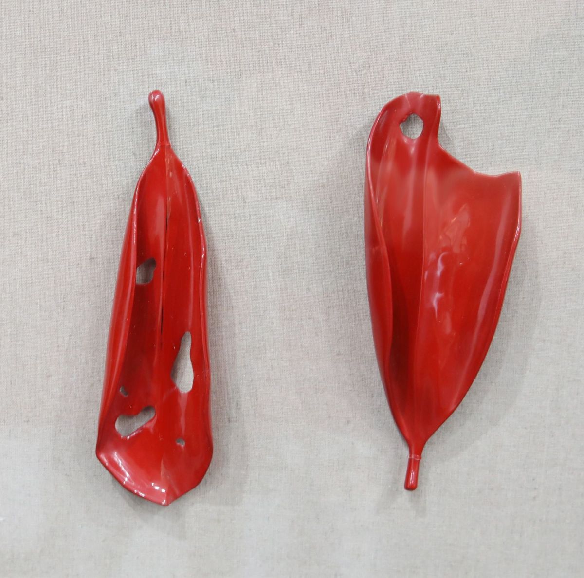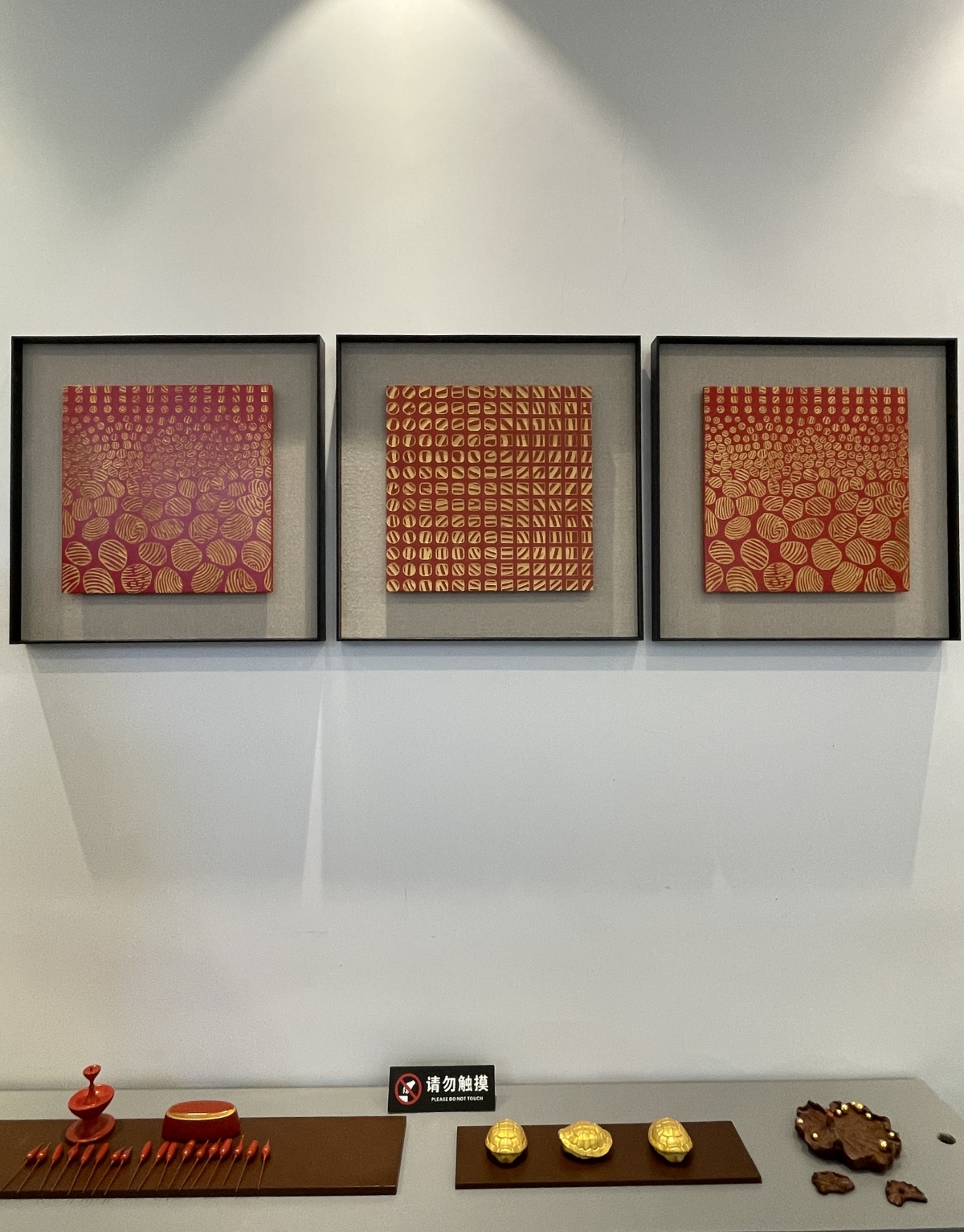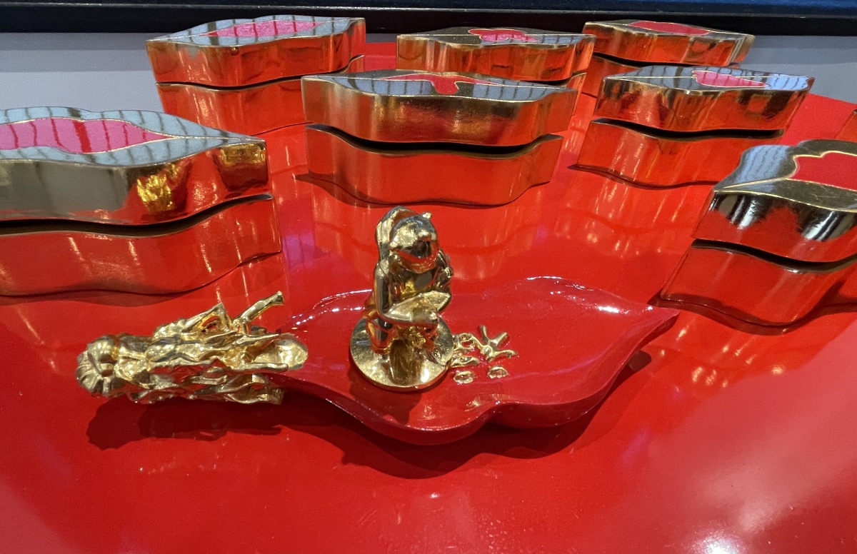 这次他的作品之一《丰收之门》,用了我们常见的蔬菜南瓜的造型,金色被掩藏在底部和顶端,再饰以螺钿粉,以丰富的细节展示了南瓜的外观和纹理。"丰收之门"不仅是一个雕塑作品,它更是一个象征,一个对丰收和生命力的赞美。它提醒我们大自然的循环和生命的连续性,让我们对自然和生活充满敬畏和感激。茶则取材于校园里的落叶,收集后自然干燥,然后采用传统的脱胎法做成茶则,叶子自然卷曲和虫蛀也形成独有的面貌,朱红的颜色让茶则成为茶桌上一抹亮色,是实用器,更是生活的美学。