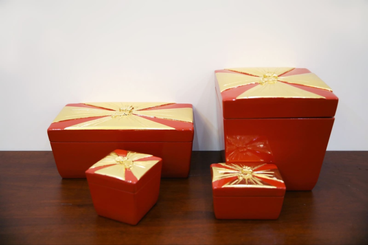 作品《福·缘》设计灵感来源于中国传统文化中的吉祥物,它的外形酷似我们生活中的包袱,上面的绸带状的金箔非常有肌理感。取谐音“包福”,寓意福气满满,象征平安和富贵。在中国传统文化中,红色象征着热情、活力和吉祥,而金色则代表着尊贵、富饶。红金大漆盒子不仅是一个实用的收纳盒,还可作为家居装饰,是中国传统文化与现代审美的完美结合。既保留了传统的大漆工艺,又融入了现代的设计理念。