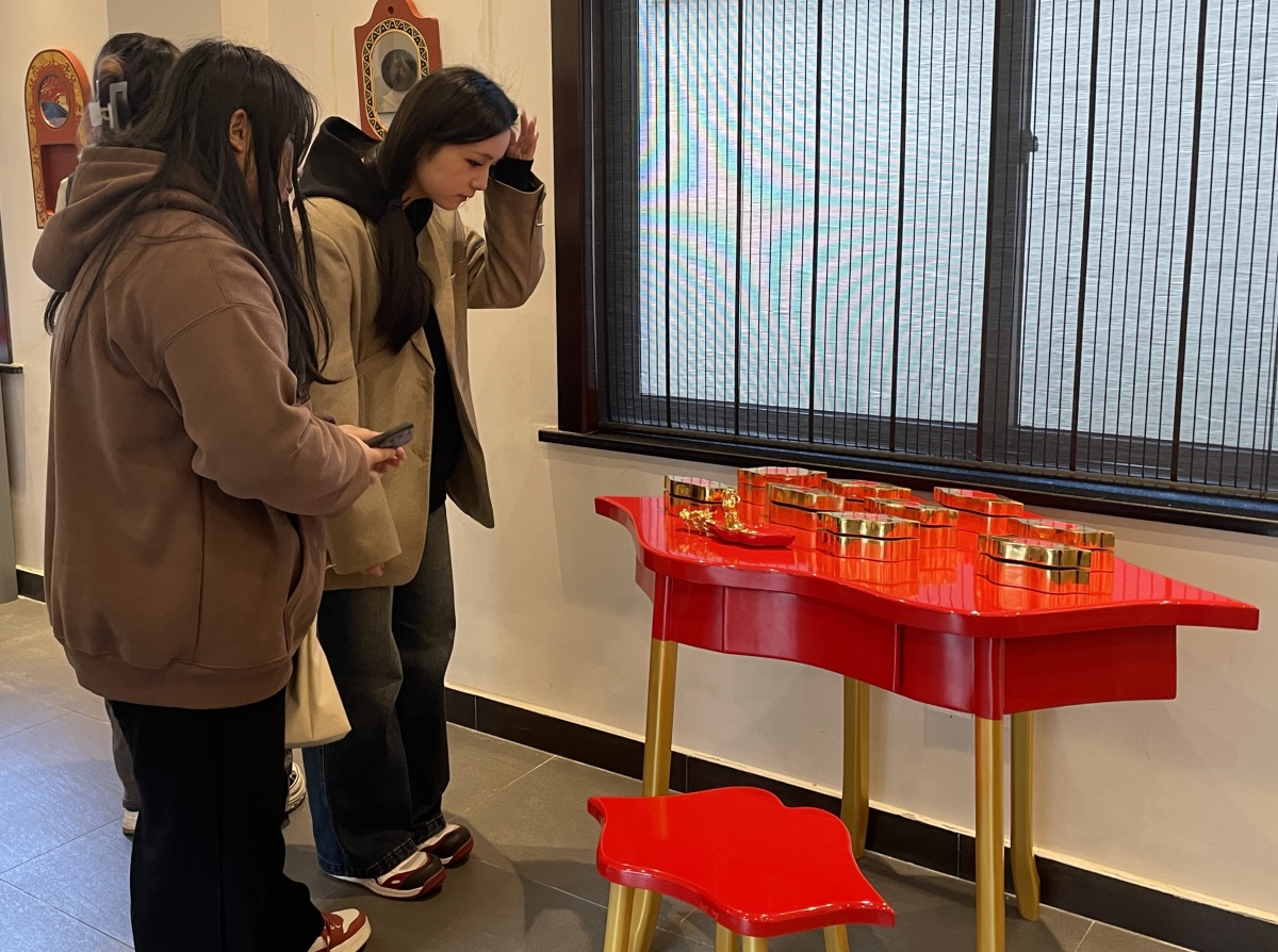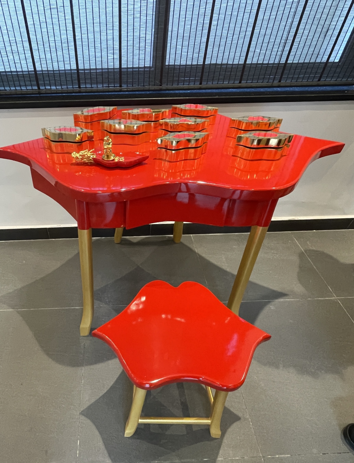 记者在现场感受到了活化的融合。红色的大漆和金箔是朱金漆木雕的主要元素,而且也因为其喜庆的颜色而大多用在传统婚庆中。《多巴胺-婚庆》将传统的大漆做成了红唇状的梳妆台和化妆盒,仿佛热烈的爱情。其波纹的曲线仿佛水的波纹,寓意宁波的地域特色。其实,玛丽莲梦露性感红唇般的形状,更有着当代的审美,这不就是最流行的“多巴胺”吗?