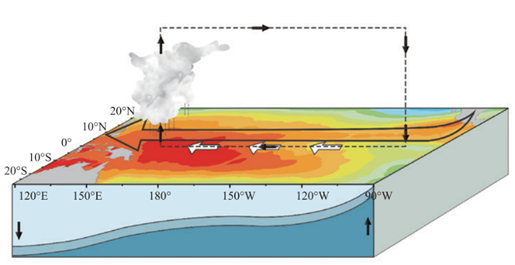 热带太平洋海洋大气状态示意图(暖色系代表海温偏暖,冷色系代表海温偏冷,颜色越深,偏暖/冷的程度越大,图片引自《中国气候》,气象出版社)