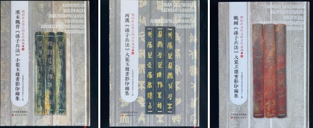 战国《孙子兵法》大篆玉简,共807片,单片长22厘米、宽2.4厘米、厚0.4厘米,总重量60.65公斤,红玉玉质,大篆阴刻,无篇名,每简镌刻8字,共计5607字;西汉《孙子兵法》大篆玉简,共775片,单片长21.2厘米、宽2.2厘米、厚0.6厘米,总重量61.5公斤,和田墨玉玉质,大篆阴刻填金,除篇名每简7字外,每简镌刻8字,共计6156字;汉末魏晋《孙子兵法》小篆玉简,共770片,单片长20厘米、宽2.4厘米、厚0.3厘米,总长18.21米,总重量57.29公斤,和田青玉玉质,局部有红褐沁和自然蚀孔,除篇名每简不同外,正文每简镌刻8字,共计6071字。
