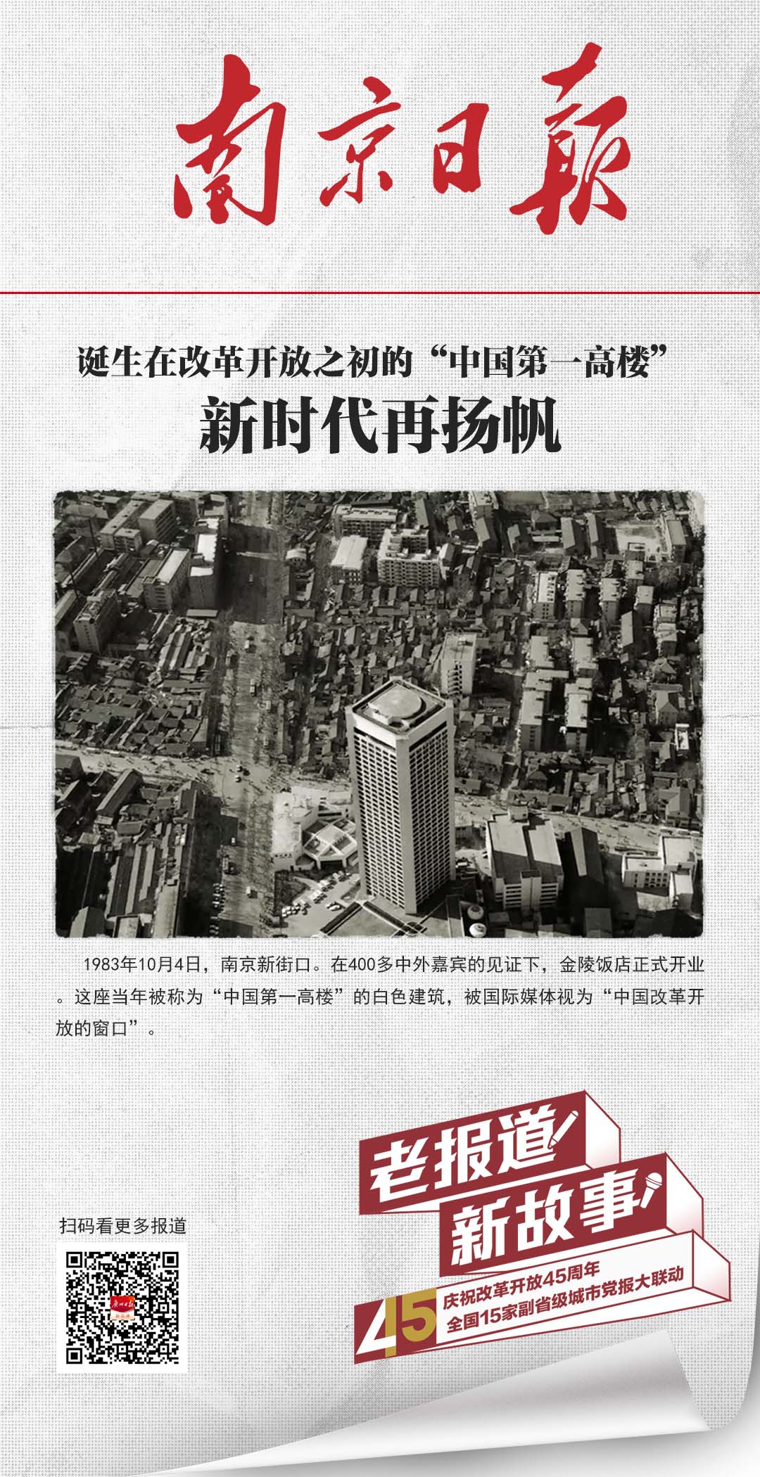 1983年10月4日,南京新街口。在400多名中外嘉宾的见证下,金陵饭店正式开业。这座当年被称为“中国第一高楼”的白色建筑,被国际媒体视为“中国改革开放的窗口”。