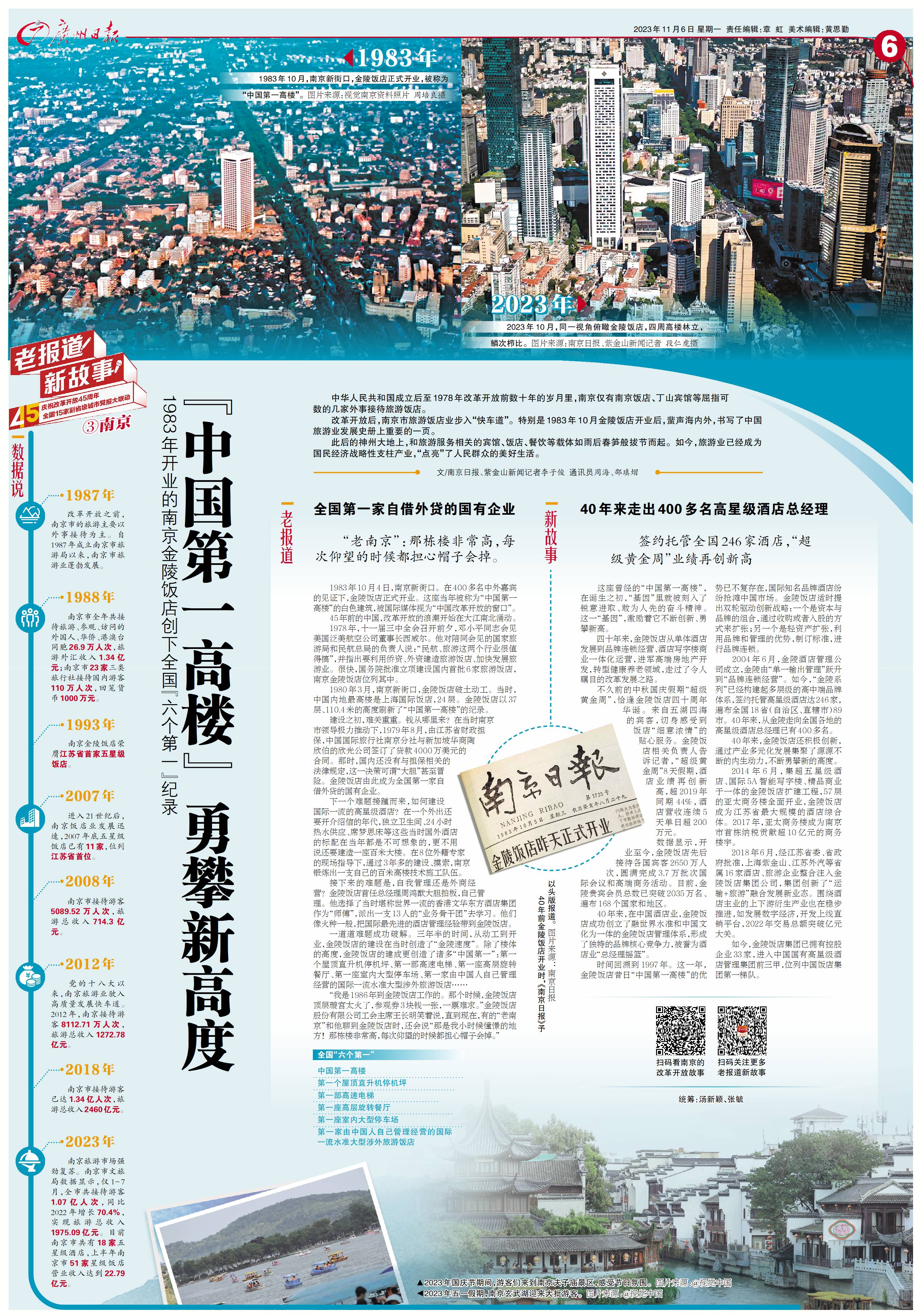 一道道难题成功破解。三年半的时间,从动工到开业,金陵饭店的建设在当时创造了“金陵速度”。除了楼体的高度,金陵饭店的建成更创造了诸多“中国第一”:第一个屋顶直升机停机坪、第一部高速电梯、第一座高层旋转餐厅、第一座室内大型停车场、第一家由中国人自己管理经营的国际一流水准大型涉外旅游饭店……
