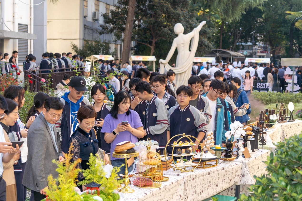 下午2点,区人大代表一行首先来到南京商业学校南校区,学校2023首届中西面点节活动正在举行。金陵饭店、状元楼、真知味、艾斯甜等10多家星级酒店、知名饭店、网红餐饮的展位,以及南京商校旅游管理系烹饪专业老师们的特色面点,齐聚校园共同展示。现场还进行了新生授服仪式,由南京商业学校六位国家级烹饪大师为新生颁发实训服,崭新端庄的实训服,是一份嘱托,一份期许,希望同学们能传承中华优秀烹饪文化,践行劳模精神、工匠精神。
