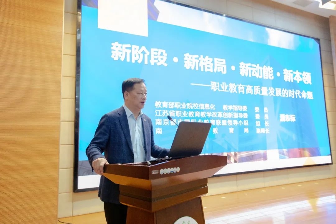 南京市教育局副局长潘东标为大家带来精彩的报告,他从“立足新发展阶段构建中、高、本一体化的现代职教体系”、“壮大发展动能、提升四链水平、推进产教融合”等多个方面详细阐述,指出加快完善现代职业教育和培训体系进程中,必须顺应互联网(人工智能)+带来的机遇和挑战,融入创新、协调、绿色、开放、共享五大发展理念,以供给侧改革提升专业建设水平,继续担当经济转型、民生改善重大引擎,让校园成为产业文化和价值观相融合、引领社会风尚的有效载体,推动大众创业、促进万众创新的宽广舞台。
