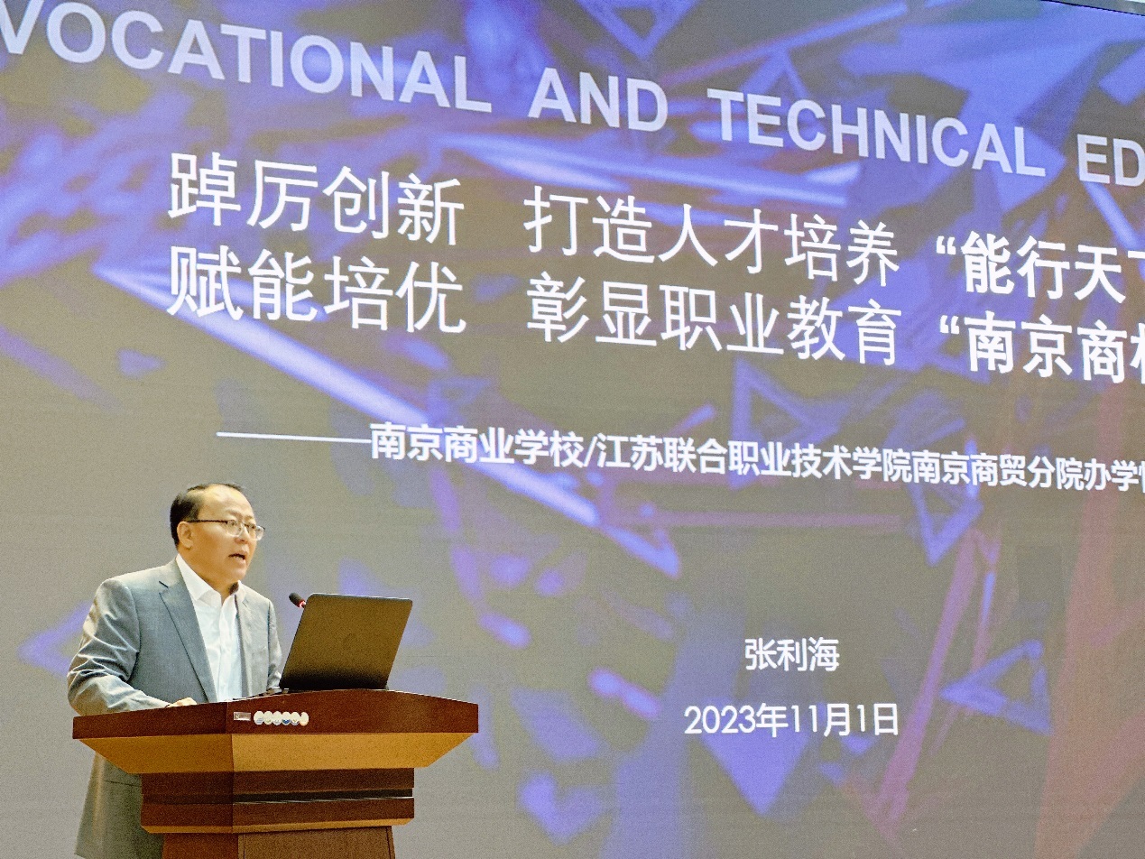 学校党委书记张利海首先以“踔厉创新,打造人才培养‘能行天下’品牌,赋能培优,彰显职业教育‘南京商校’特色”为题,向领导嘉宾汇报学校办学情况。南京商业学校始终不忘类型教育的使命与担当,以2023年前10个月为例,一系列实践探索取得突出业绩:今年全省技能大赛,学校百名师生参加30个项目,取得10金13银15铜38枚奖牌的成绩;省教学成果奖一等奖1项、二等奖2项,由学校领衔的1项教学成果荣获国家级教学成果二等奖,另外还有2位教师参与的2项教学成果均获国家级二等奖;2023年709名大专毕业生,241人通过专转本考试被本科院校录取,其中公办本科院校录取91人,绝对人数及录取率再创新高;两年前,学校成立马克思主义学院,成为学校德育工作的最顶层设计,由党委书记兼任院长,统领全校大德育工作阵地……职业学校能培养什么人?张书记说,我们立德树人,五育并举,培养“自食其力的人,爱党爱国的人,能行天下的人,坚信我能、手握技能、能力全面;身心两健、不懒惰的人”,这样的人就是社会主义建设者和接班人。