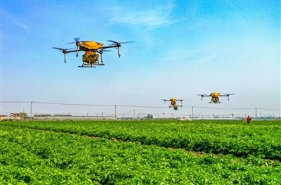 滕州市界河镇一处马铃薯田地上,种植户通过无人机施肥。宋海存摄