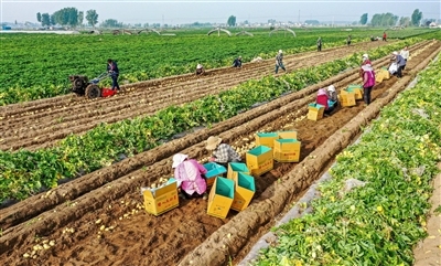 滕州市大坞镇的马铃薯销售企业员工在田间装箱。宋海存摄