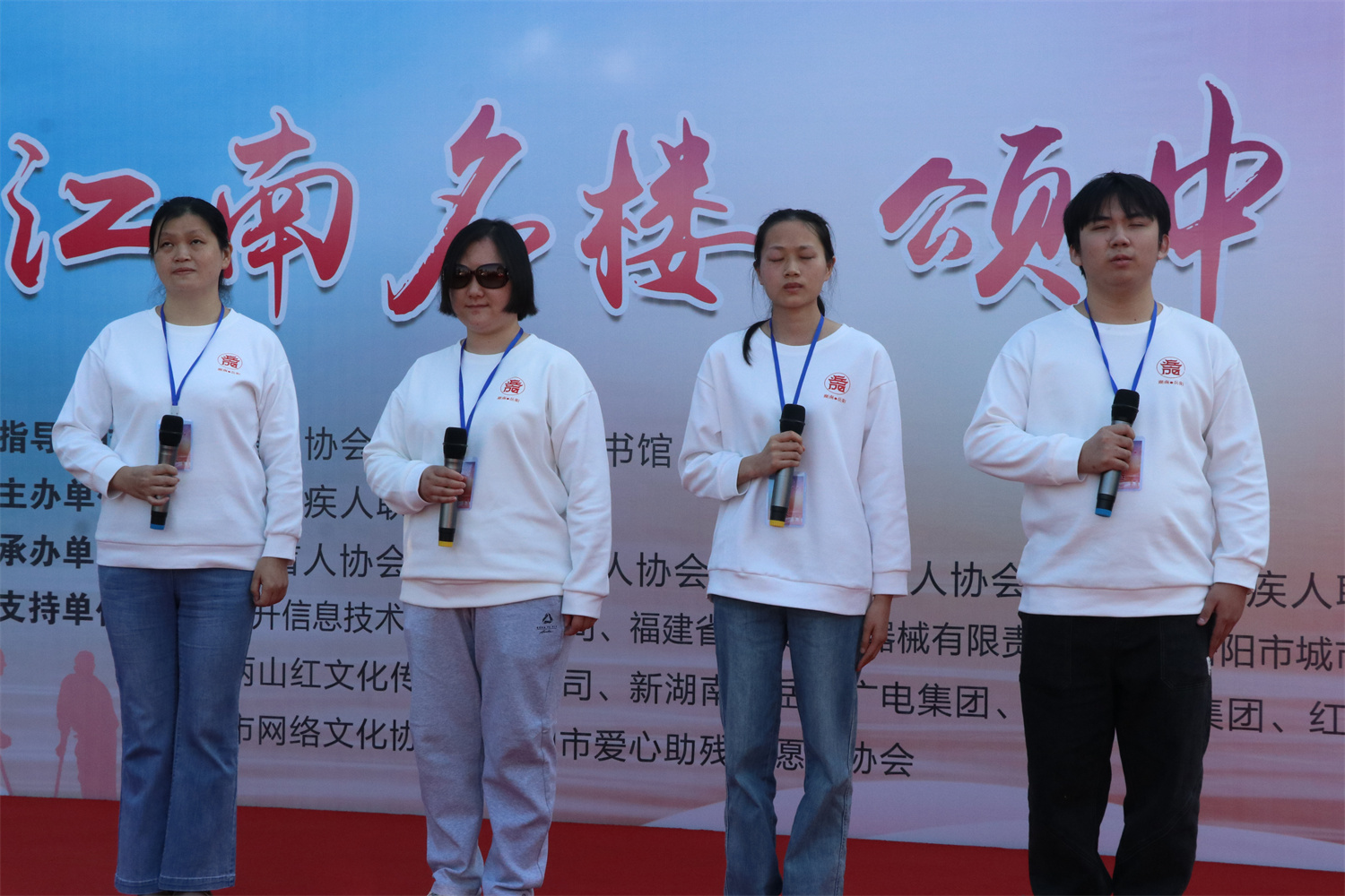 何帆、童靓、周敏、邹子欣四人声音洪亮、情感饱满,合诵的《读中国》赢得了在场观众的热烈掌声。“予观夫巴陵胜状,在洞庭一湖。衔远山,吞长江,浩浩汤汤,横无际涯,朝晖夕阴,气象万千……”当来自湘鄂赣三省的盲人站在台上集体朗诵《岳阳楼记》的那一刻,现场气氛再一度被推向高潮。