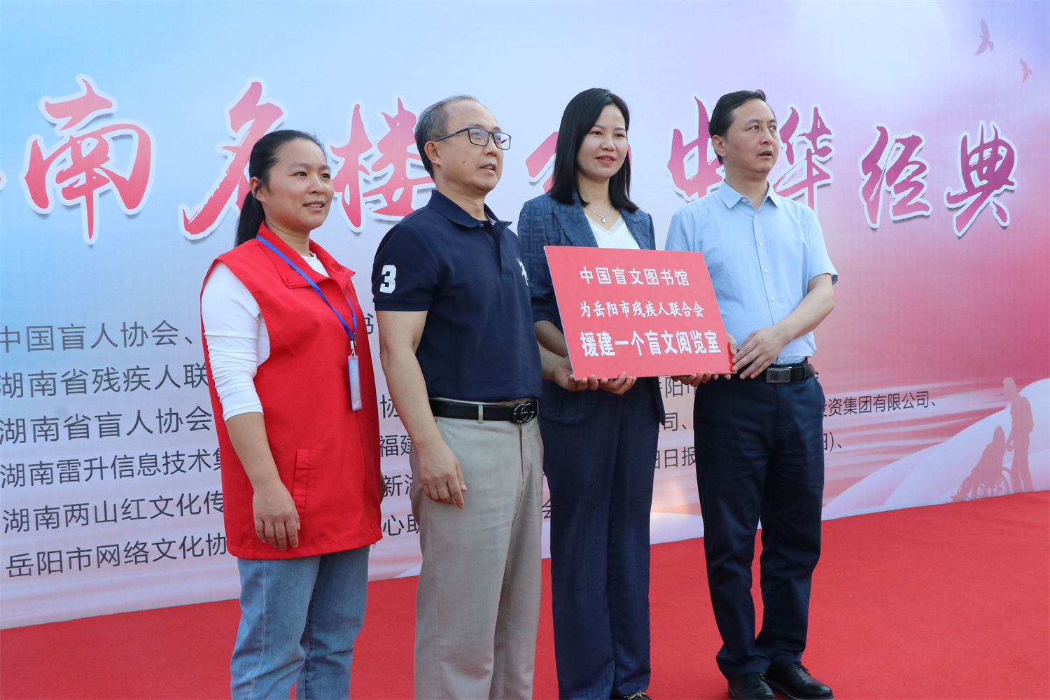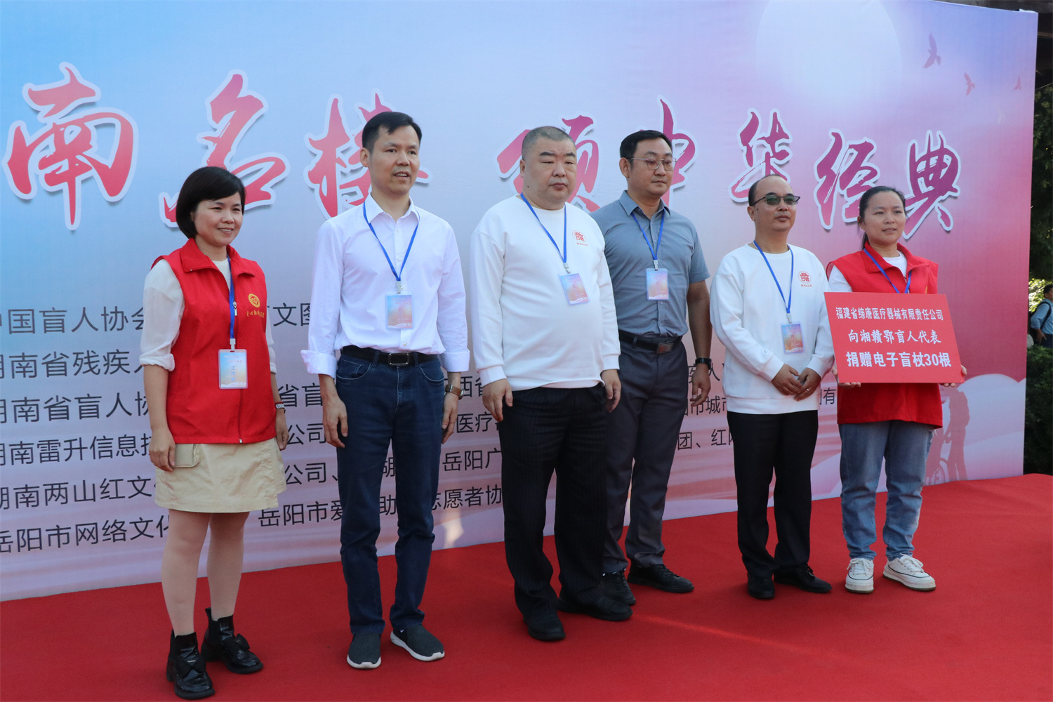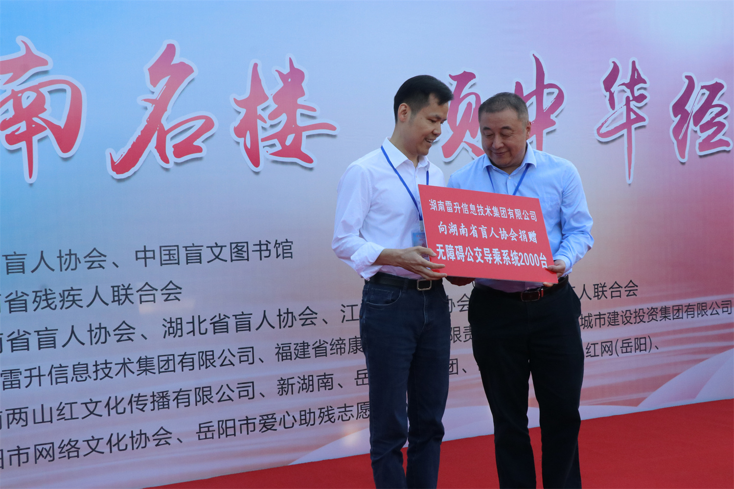 活动中,中国盲文图书馆负责人向岳阳市残疾人联合会援建盲文阅览室;湖南雷升信息科技集团有限公司向湖南省盲人协会捐赠无障碍公交导乘系统2000台;福建省缔康医疗器械有限责任公司向湘赣鄂盲人代表捐赠电子盲杖30根。