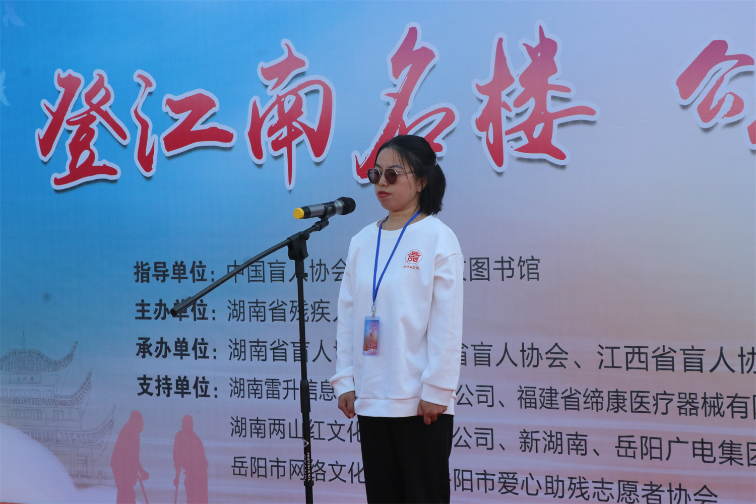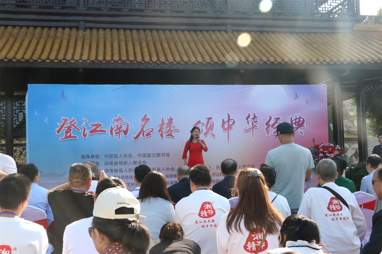 岳阳晚报全媒体讯(记者 颜君 冯刚 通讯员 姚平)10月17日,由中国盲人协会、中国盲文图书馆指导,湖南省残疾人联合会主办,湖南省盲人协会、湖北省盲人协会、江西省盲人协会和岳阳市残疾人联合会承办的“登江南名楼,颂中华经典”主题文化活动在岳阳楼景区举行。中国盲文图书馆党组成员、副馆长何川,中国盲人协会副主席刘芳,湖南省残联党组成员、副理事长钟娜,岳阳市政协副主席范泽容,湖北省盲人协会主席胡玮,江西省盲人协会主席黄强,湖南省盲人协会主席黄程,湖南省残联组人部部长言建文,岳阳市残疾人联合会党组书记周拥军、理事长杨善,株洲市残联党组成员、副理事长黄晓燕等出席活动。