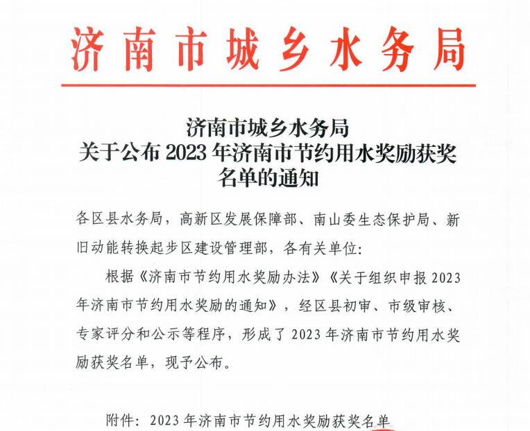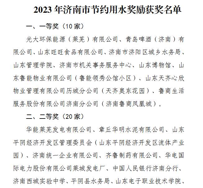 近日,济南市水务局下发《关于下达2023年节约用水奖励资金的通知》,公布了获得2023年节约用水奖励资金的企业,莱芜区3家单位获奖。其中光大环保能源(莱芜)有限公司获得一等奖第一名、华能莱芜发电有限公司、华电国际电力股份有限公司莱城发电厂分别获得二等奖,分别收到了济南市节水奖励资金10万元、5万元、5万元。