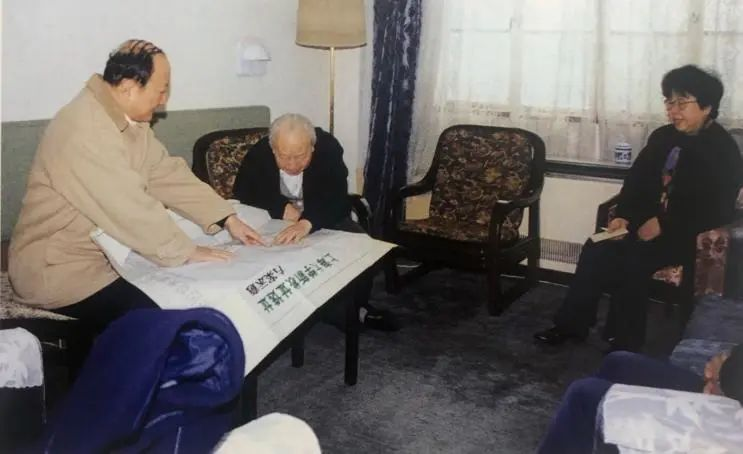 1996年2月,钱伟长老校长(中)与时任上海市市长徐匡迪(左)、时任上海市教委主任郑令德(右)共商新校区选址方案