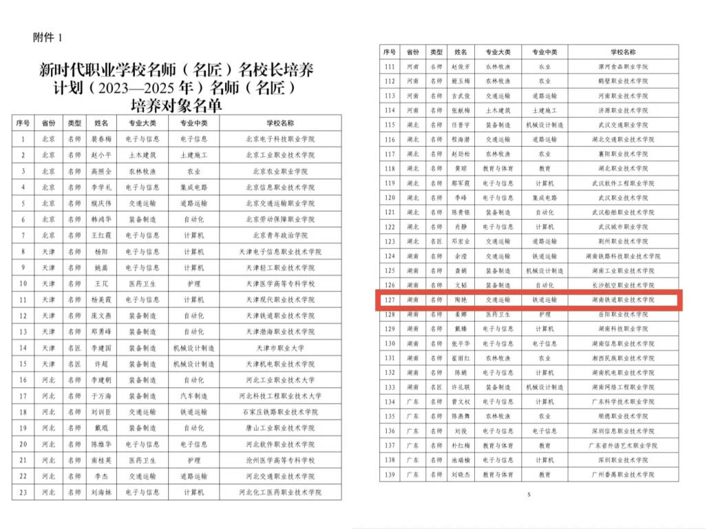近日,教育部办公厅下发了《关于公布新时代职业学校名师(名匠)名校长培养计划(2023—2025 年)培养对象和培养基地名单的通知》(教师厅函〔2023〕23 号),湖南铁道职业技术学院轨道交通机车车辆学院院长陶艳教授入选新时代职业学校名师(名匠)培养对象。