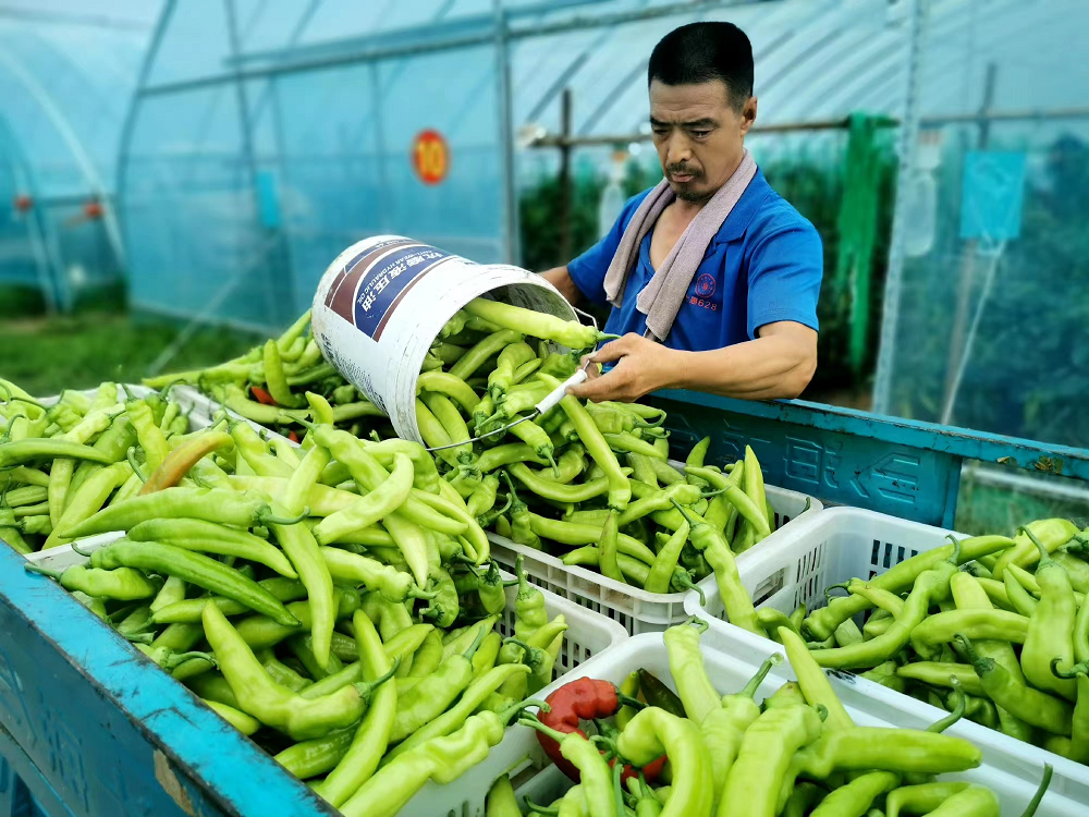 初秋时节,神救山斑斓山色尽收眼底,山下一排排大棚里黄皮尖椒挂满枝头,长势喜人,工人正在称重装车,黄皮尖椒已经踏上了前往市场的路途。这里是梯门镇东沟流村党支部书记武传柱的大棚,自进入采摘期后,在基地里每天都有多名工人忙着采摘尖椒,武传柱也从未停止忙碌。