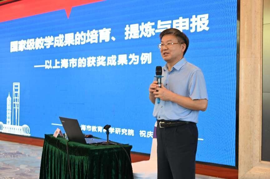 会议现场,上海市教育科学研究院普教所培训中心主任祝庆东以上海的获奖成果为例,作了《国家级教学成果的培育、提炼与申报》报告,对教学成果的类型和评审要求、撰写和填报经验、提炼与表达方法、培育和孵化策略进行深入阐述。