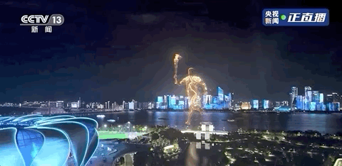 9月23日晚,象征着上亿名数字火炬手的一颗颗粒子汇聚在钱塘江上,最终组成了数字人的形象。数字人在钱塘江上踏着浪花,一步步来到开幕式主会场上空,和第六棒火炬手在现场共同点燃了主火炬塔。
