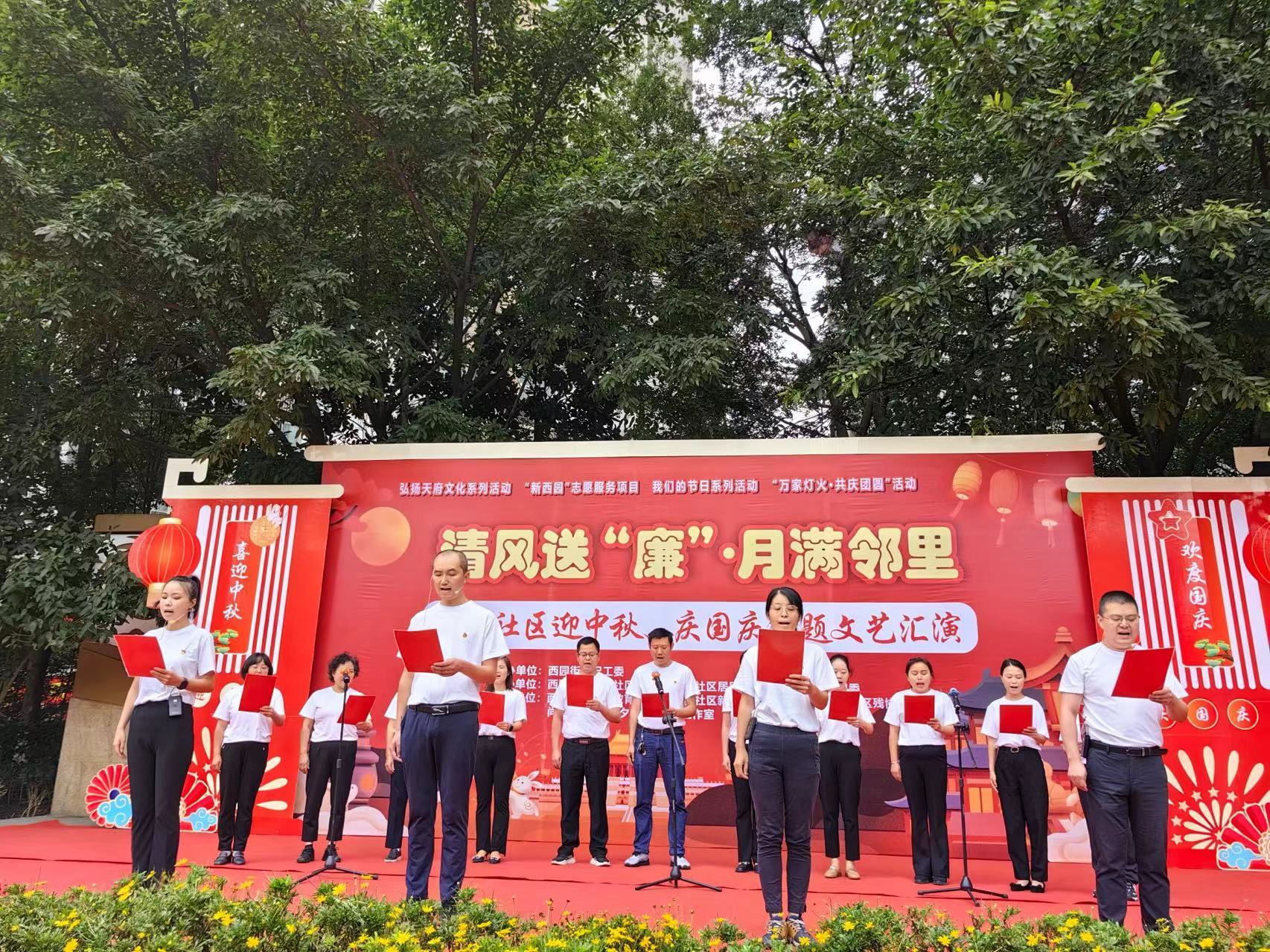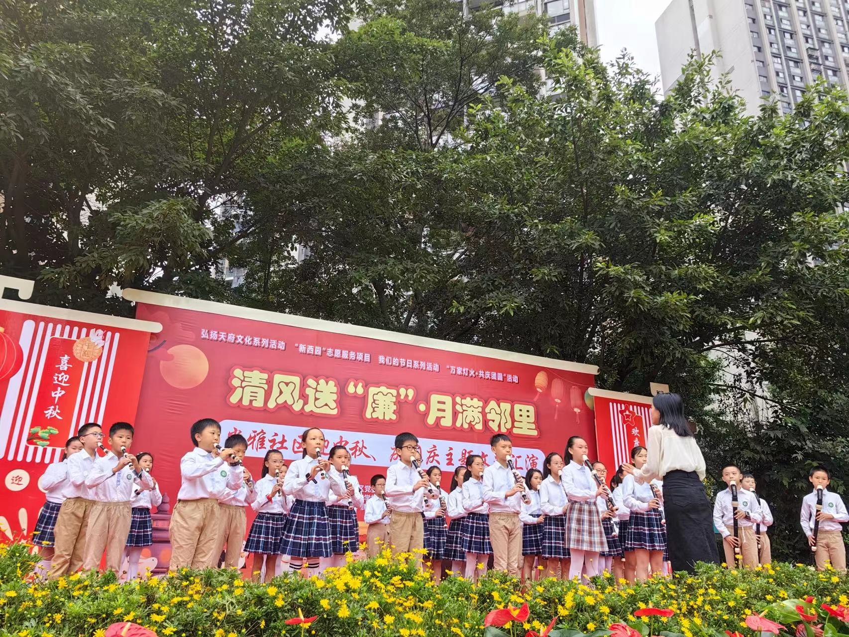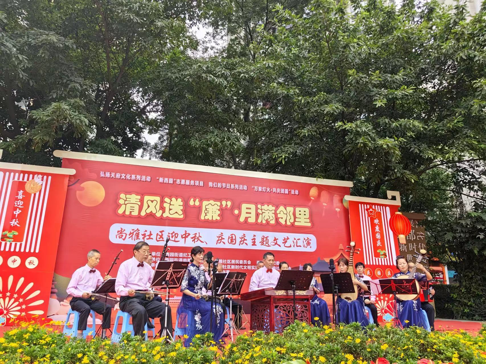 9月23日,成都高新区西园街道尚雅社区在双拥广场开展了清风送“廉”·月满邻里——迎中秋、庆国庆文艺汇演。本次活动以“家校社企”为支持平台,通过联动企业、学校、商家、小区院落、社区志愿者等多方资源力量,为社区居民搭建展示自我、互动交流、服务汇集的邻里圈,推动形成共建共治共享的社会治理共同体。