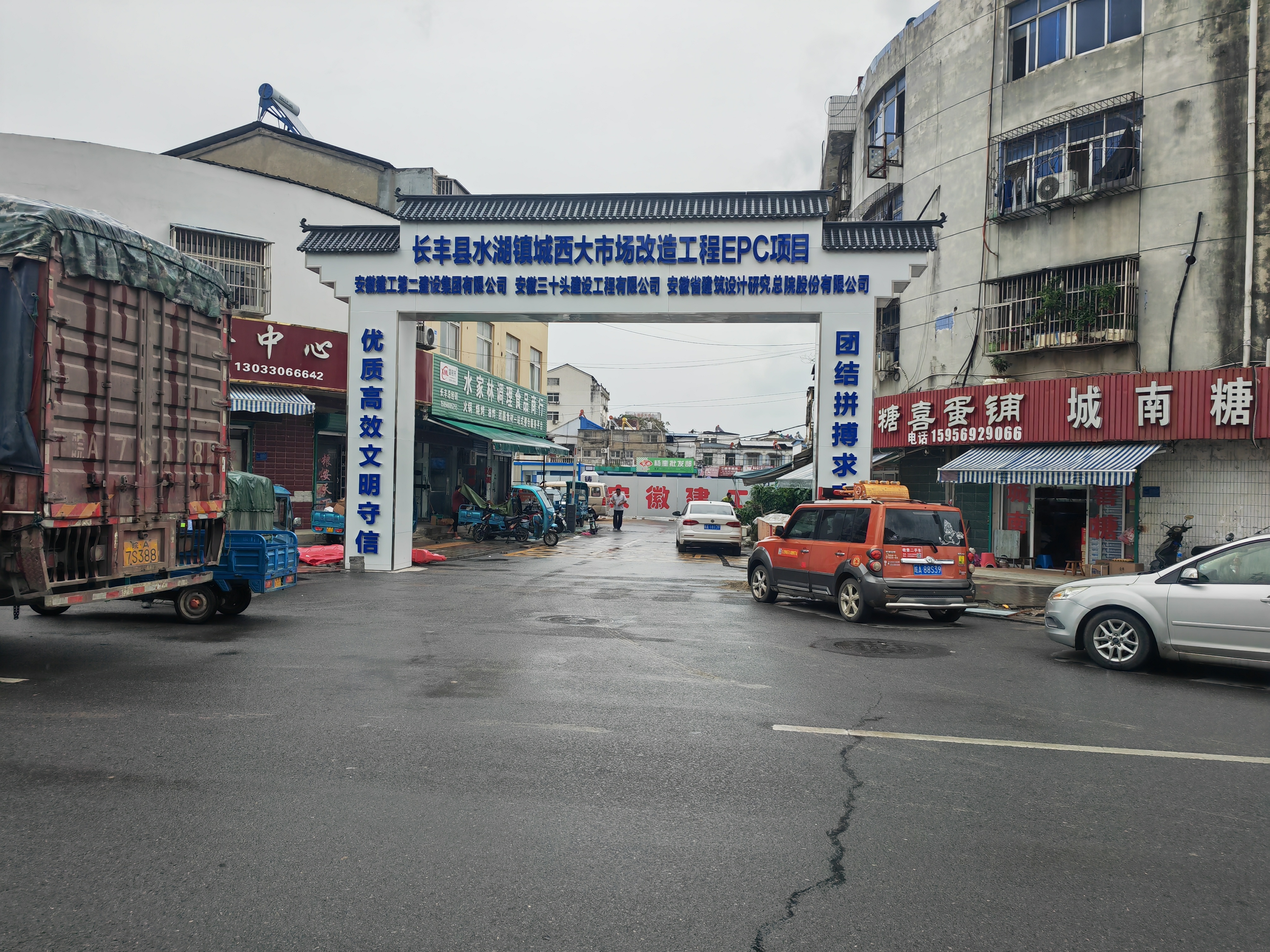 长丰县水湖镇城西大市场,位于长丰县老城区杨公路与长丰路交口东南角,道路东至建设巷、南至天文巷、西至杨公路、北至长丰路,占地面积约17415平方米。周边多为居民居住区,由于该市场承载水湖镇大部分的居民的日常生活需求。但由于时间久远,市场内电线老化、混乱;违章搭建情况严重;卫生环境设施差;机动车、非机动车乱停乱放、流动摊贩占道经营等问题严重。