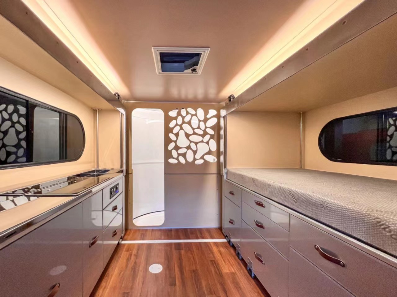 这款“百变侠”拖挂房车重量为1.1吨,高度为1.75米,可以直接进入到地下停车场,驻车状态可以轻松变身为原始空间的3倍以上,宽敞的空间可供4人活动。