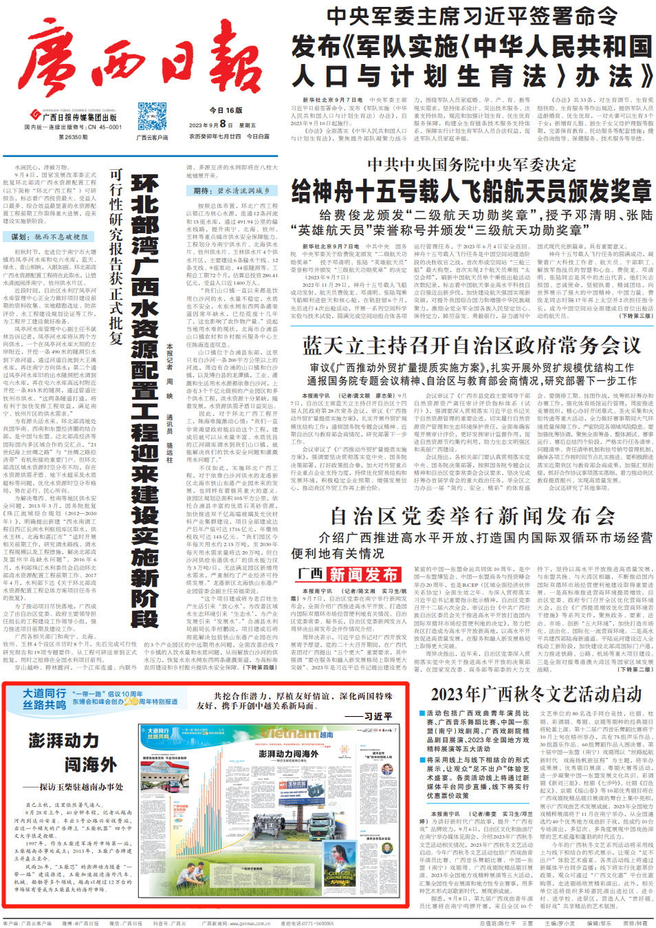 广西日报9月8日头版报纸版面