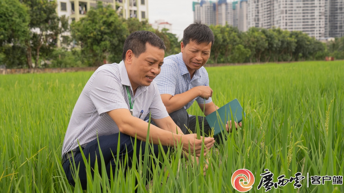 越南农业大学作物发展研究所副所长阮文拾博士(前)观察水稻生长情况。