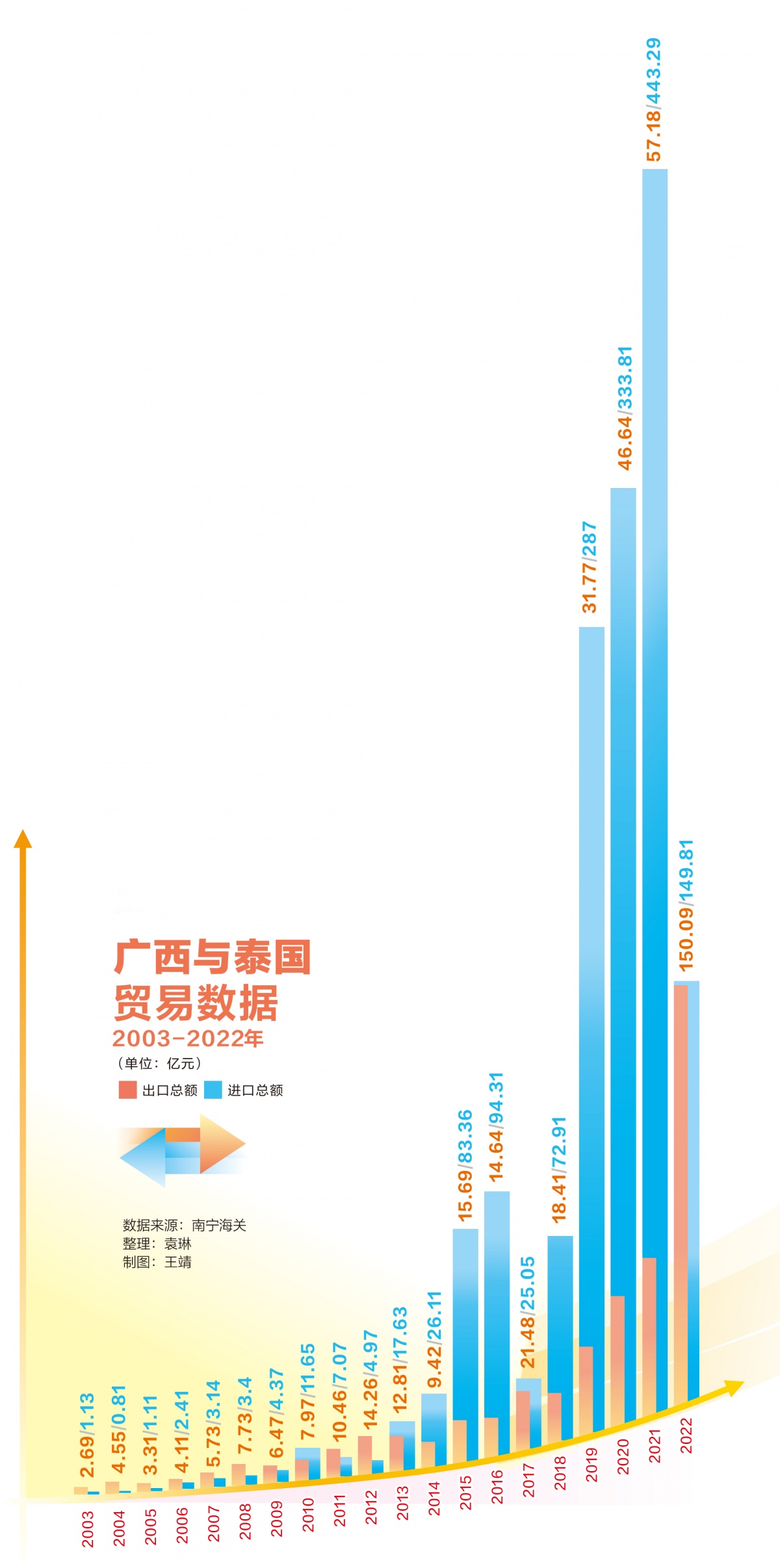 广西作为中国最大的泰国水果进口地,在2020年就开通了泰国水果进境专列。为加快与东南亚国家的直航运输,进一步压缩海运时间,目前钦州港已开通7条至泰国的集装箱直航航线,辐射泰国的曼谷、林查班两大主要港口。其中,林查班—钦州港的“水果快线”每周5班,从林查班至钦州港仅需3天,为东南亚农产品通往中国搭建最便捷的“海上高速”。