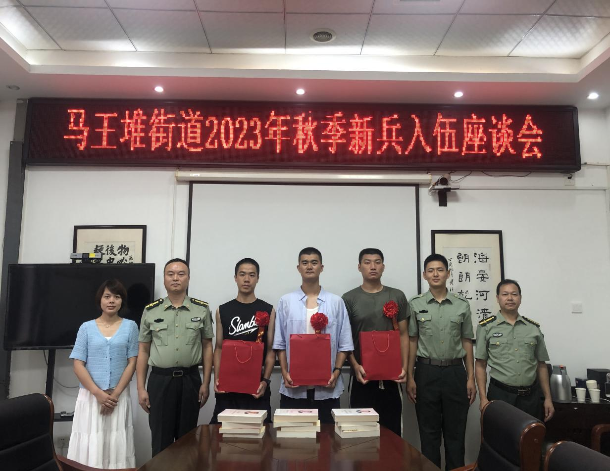 (通讯员 胡静 董祖赐)9月13日上午,长沙市芙蓉区马王堆街道武装部组织召开2023年秋季新兵座谈会,为2023年应征入伍报效祖国的三名大学生新兵举行欢送仪式。