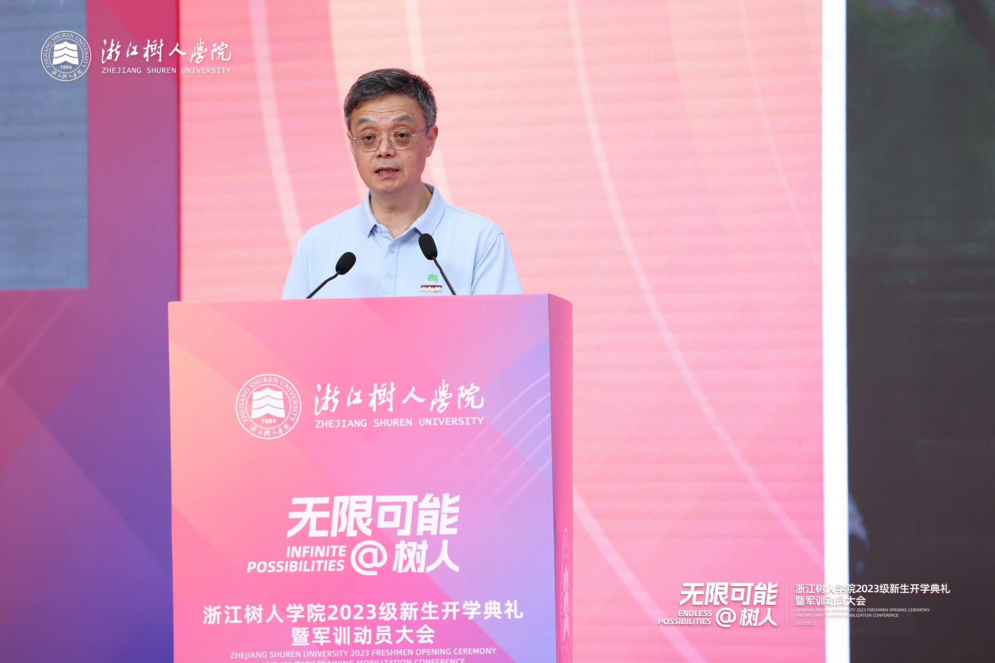 中国新时代,杭州新亚运,树人新同学。今天,来自全国15个省市区、21个民族的5435名新同学,还有5位来自俄罗斯、摩洛哥、土库曼斯坦和哈萨克斯坦的留学生,相聚在大运河畔、鲁迅故里。我谨代表全校18000余名师生向新同学、向留学生表示热烈欢迎。也借此机会,向辛勤培育你们成长成才的家长朋友们,致以最衷心的感谢。