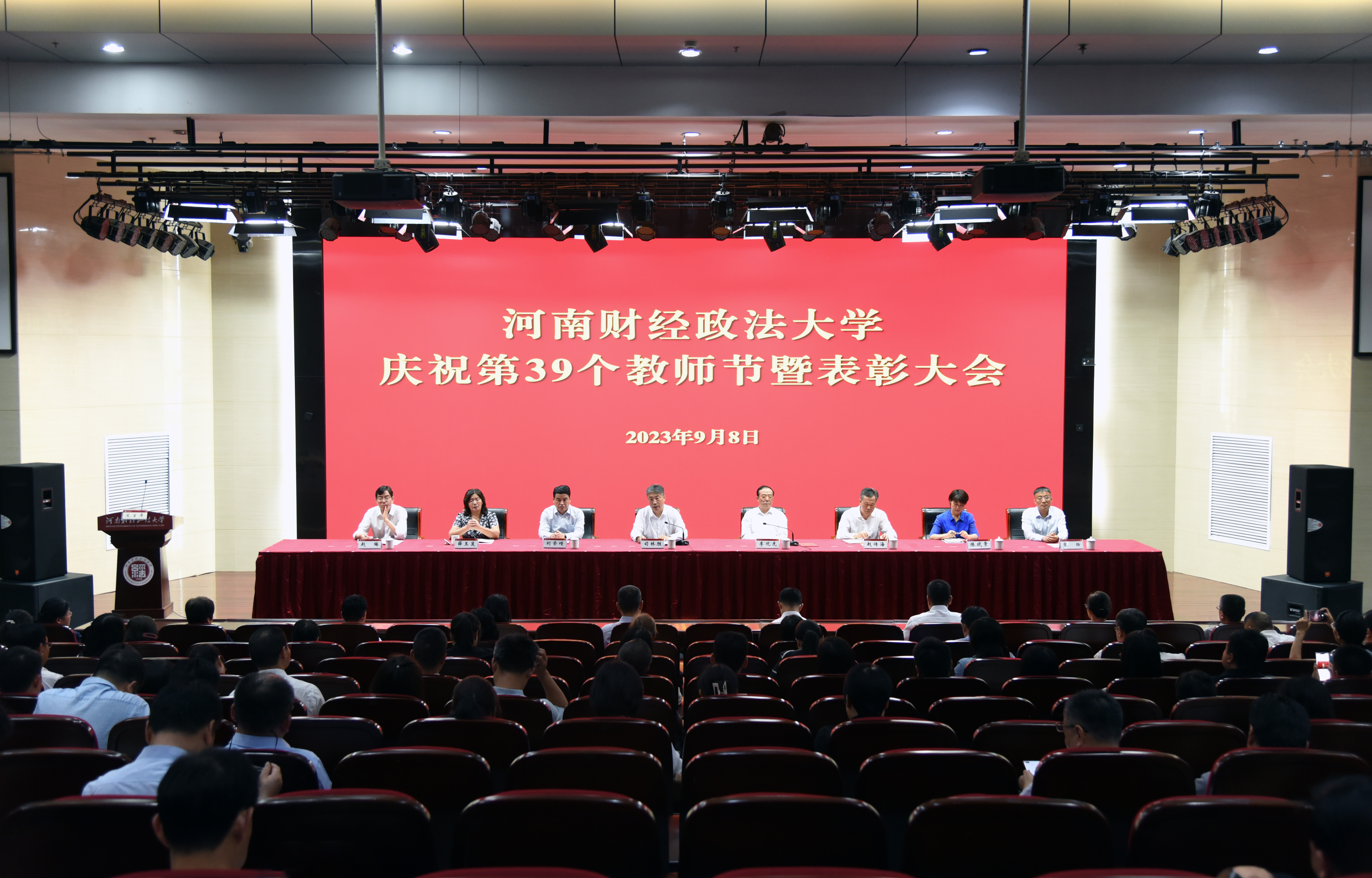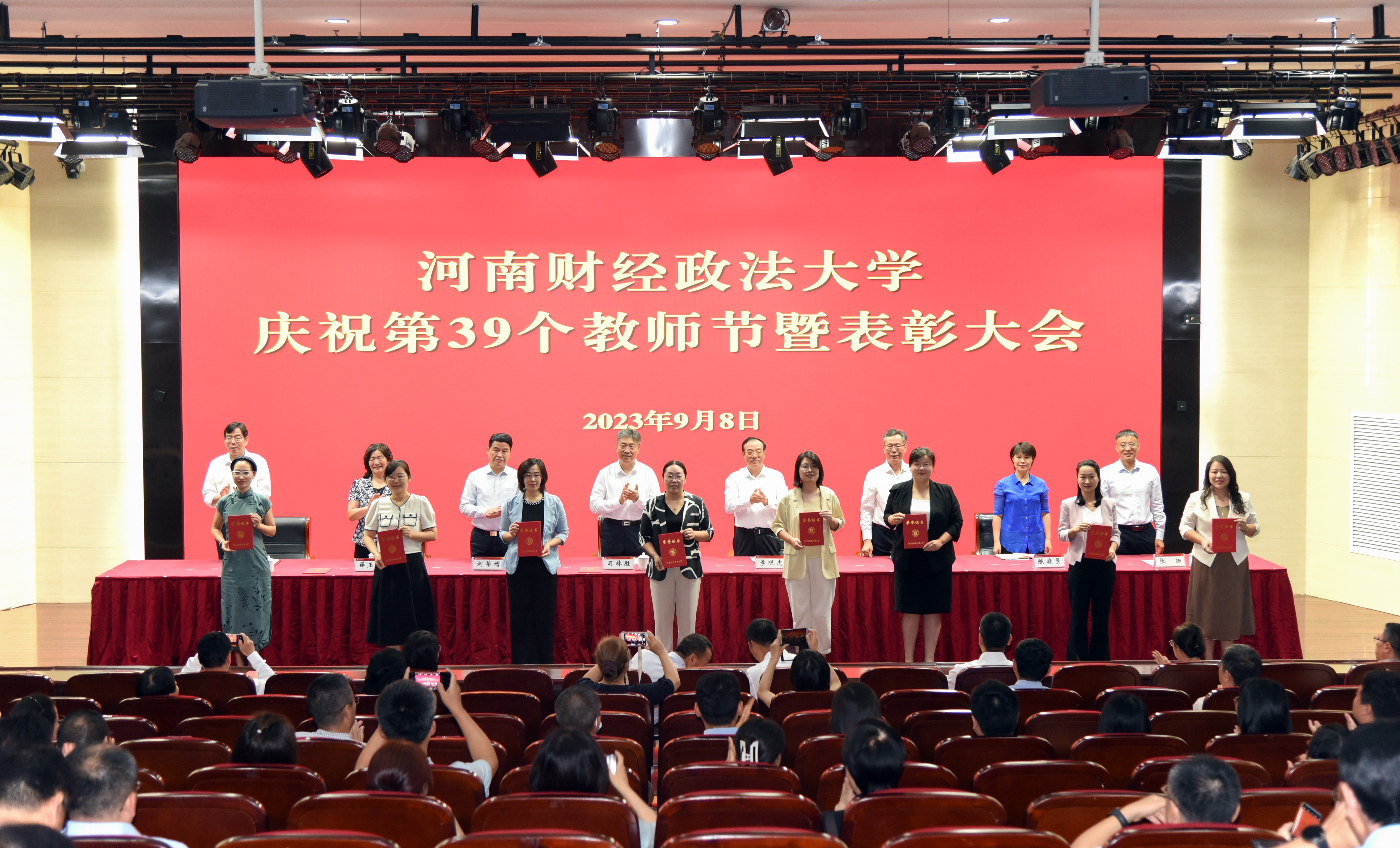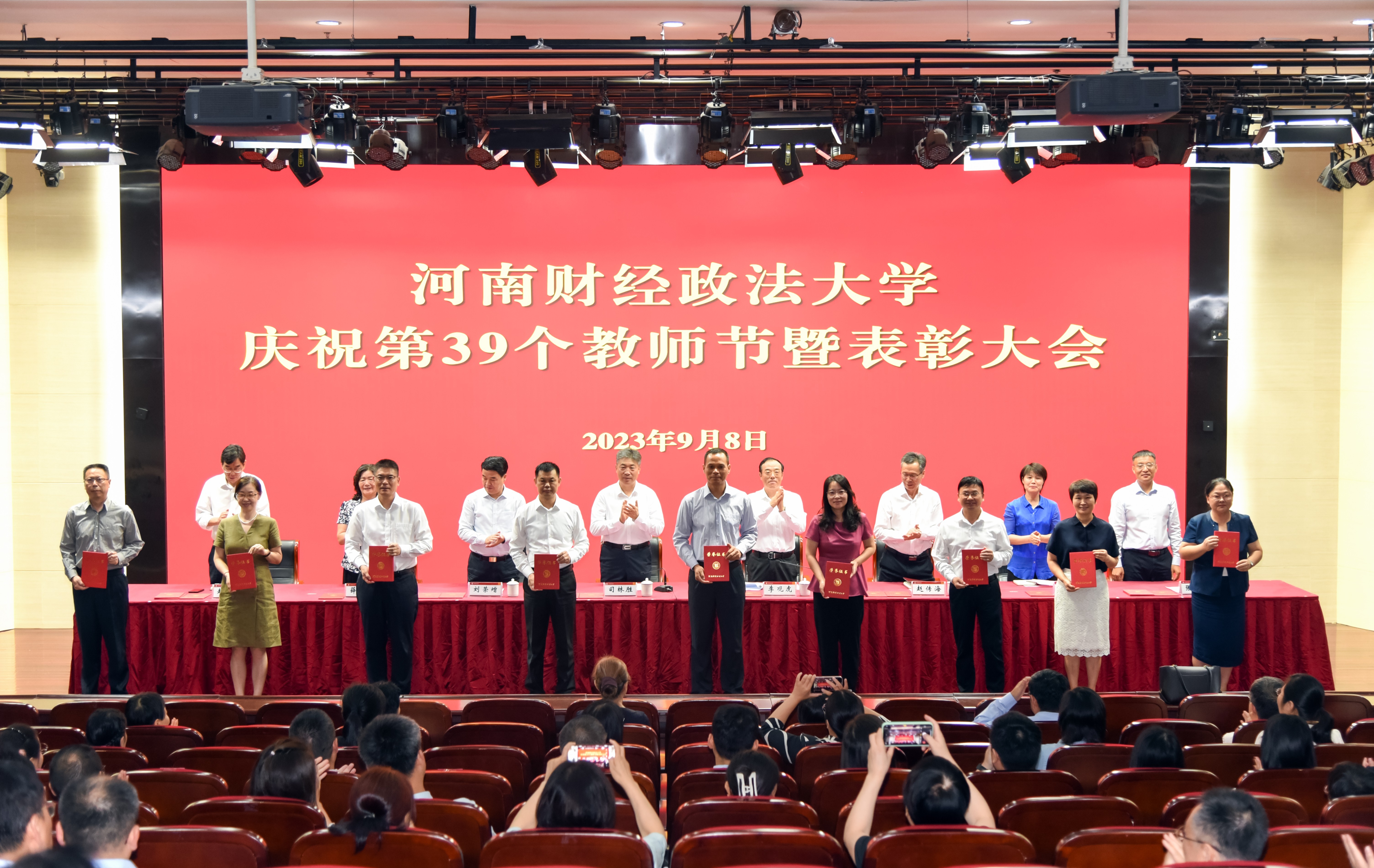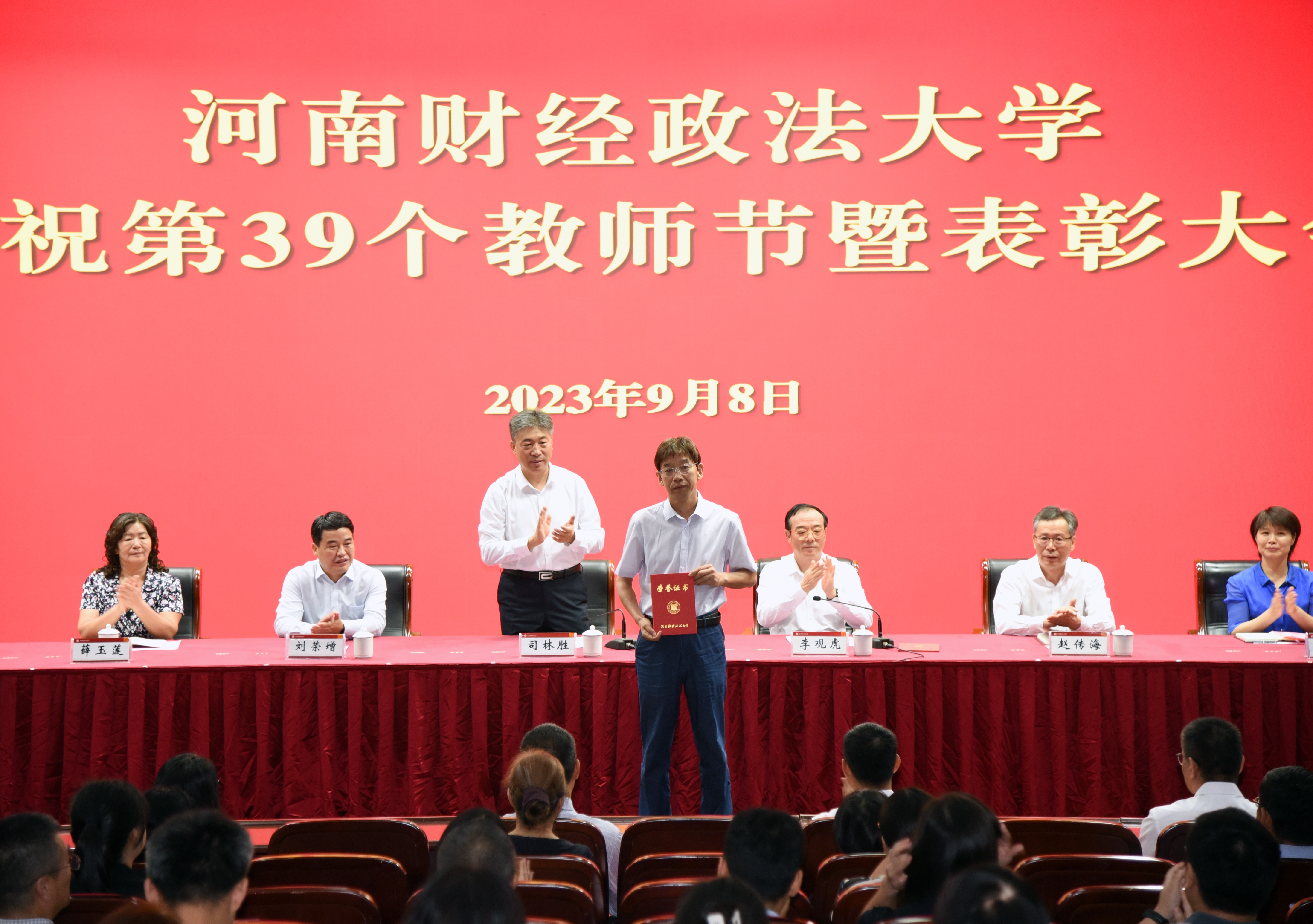 躬耕教坛,强国有我。9月8日上午,在第39个教师节来临之际,河南财经政法大学举办庆祝第39个教师节暨表彰大会,向广大教职工送上节日祝福,鼓励全校教职工在学校高质量发展的新征程上顽强拼搏、不懈奋斗。校党委书记、校长司林胜等校领导出席大会。从事教育工作满30年的教职工,第四届校青年教师课堂教学竞赛奖获奖教师,一学年来获得国家级项目立项、受到省级以上表彰、获得省级以上科研奖励的人员,教师代表、学生代表,以及各单位负责人参加会议。会议由校党委副书记、工会主席李观虎主持。