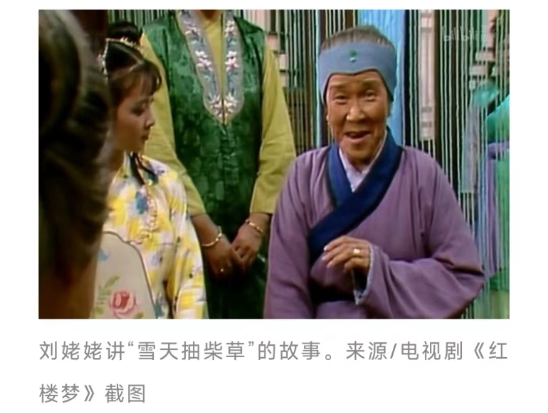刘姥姥先编了一个“雪天抽柴草”的故事,成功引起了宝玉的注意。刘姥姥讲的时候,很可能根据贾母身边的孙女、外孙女现场发挥,以“极标致的小姑娘”为主角。黛玉虽然对刘姥姥有些不屑,仍然记住了“雪下抽柴”的细节,并在之后用来打趣宝玉,可见刘姥姥的故事对他们是很有吸引力的。故事没讲完,外面吵嚷起马棚失火,宝玉对这不太关心,还想问那个女孩的后续,贾母说都是讲抽柴草引出火来的。刘姥姥听出贾母有些不满,连忙见机行事,讲了个“老奶奶积德行善,唯一的读书好的孙子死后,又得了个聪明伶俐的孙子”的因果报应故事,这一故事正符合贾珠、宝玉的现实情况,比上一个故事更得贾母、王夫人的欢心。