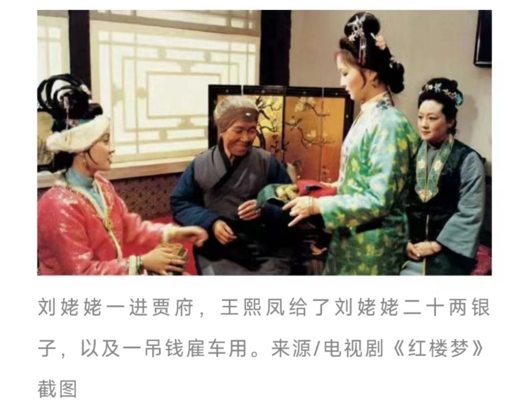 依靠周瑞家的关系,刘姥姥祖孙被引荐到当家人王熙凤房中,刘姥姥眼花缭乱,手足无措,等到终于有机会向凤姐求告,说的话也透出卑微:“今日我带了你侄儿来,也不为别的,只因他老子娘在家里,连吃的都没有。如今天又冷了,越想没个派头儿,只得带了你侄儿奔了你老来。”这种硬攀亲戚的叫法,连周瑞家的都觉得莫名其妙。幸运的是,刘姥姥一进贾府正值整体兴盛期,“得意浓时易接济”,王夫人指示“不可简慢”,王熙凤举手之劳,便打发了刘姥姥二十两银子,又多给了一吊钱让她带着板儿坐车回去。这二十两银子,足够刘姥姥全家过上一年,解了他们的燃眉之急。刘姥姥要留下一块银子给周瑞家的,周瑞家的并不把这钱放在眼里,但也增加了她对刘姥姥的印象分。
