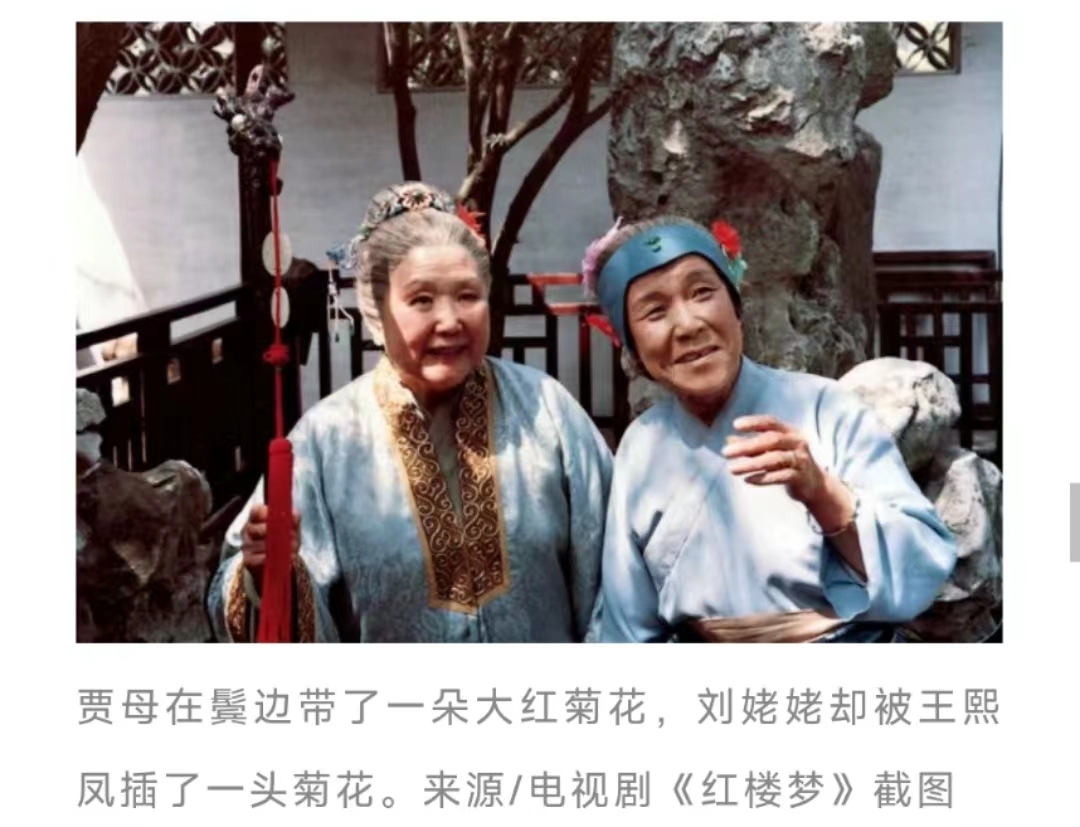 这一天的开始,就显得热热闹闹。正值菊花时节,李纨让丫头送上各色折枝菊花,贾母拣了朵大红菊花戴在鬓边,凤姐却横三竖四地给刘姥姥插了一头。鲜花和农村老太婆形成鲜明对比,贾母等人观之大笑,刘姥姥却大大方方地自嘲:“我这头也不知修了什么福,今儿这样体面起来。”“我虽老了,年轻时也风流,爱个花儿粉儿的,今儿老风流才好。”刘姥姥开得起玩笑,这出戏才能演得让贾母满意。