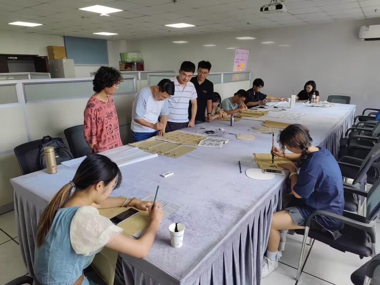 在学院多功能活动室,为了庆祝教师节,同学们和老师们一起挥毫泼墨,一笔一划,都书写出老师们桃李芬芳的育人之路,也表达了同学们对师恩的感念之情。教师王超写下“躬耕教坛,强国有我”,表达自己对教育事业的奉献和决心。恰逢学校七十周年华诞,学生刘钧栩写下“春华秋实七十载,风雨兼程铸辉煌”,以赞扬学校在过去七十年取得的辉煌成就。同学们还与老师们一起绘制了中秋团扇,让教师节更增添了几分团聚圆满的意味。