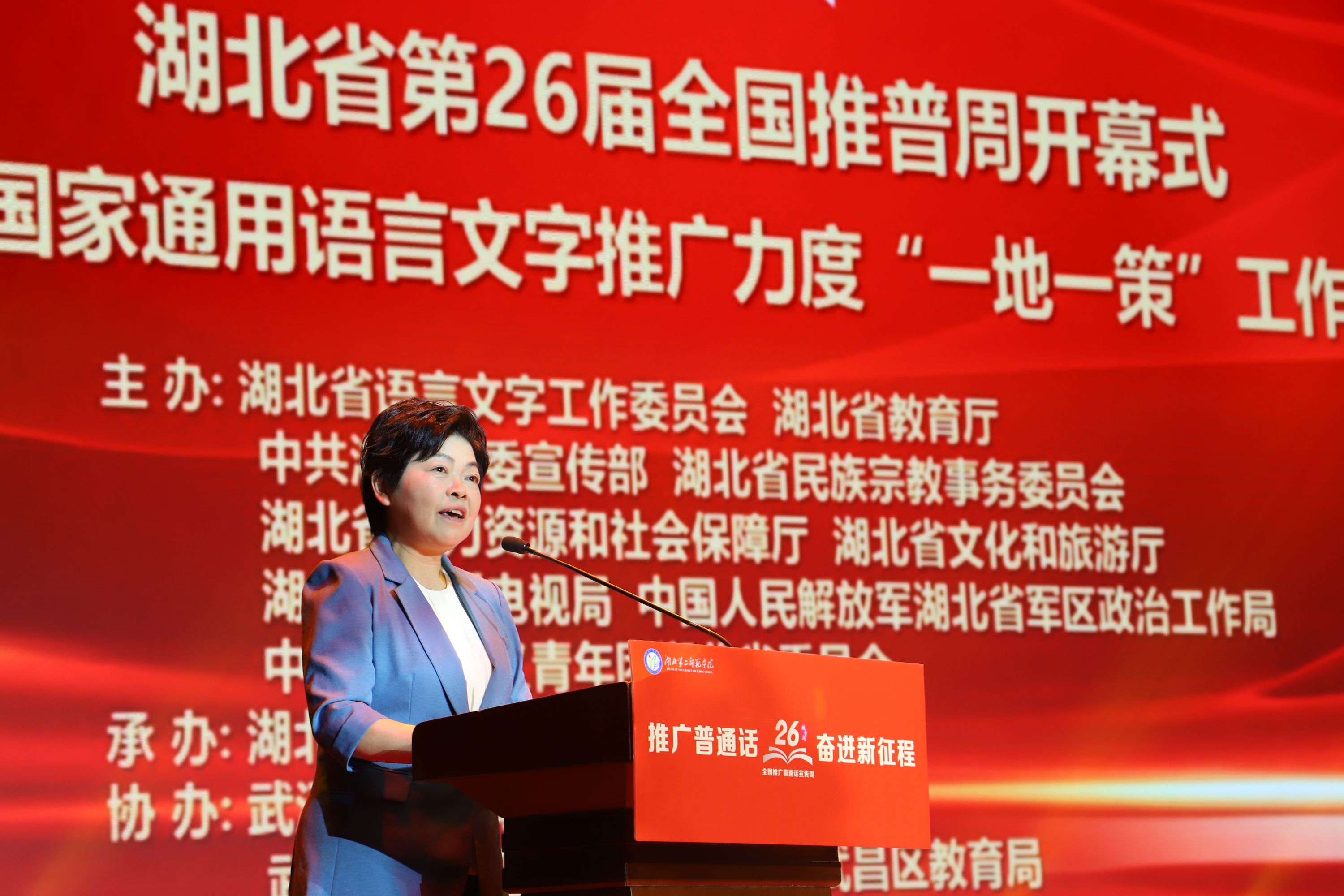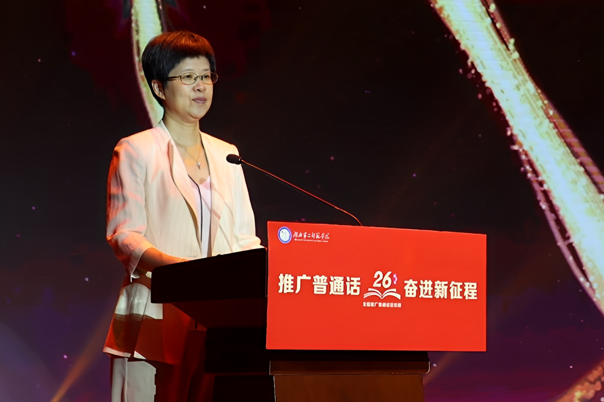湖北第二师范学院党委书记杨鲜兰主持湖北省第26届全国推广普通话宣传周开幕式。湖北第二师范学院 供图