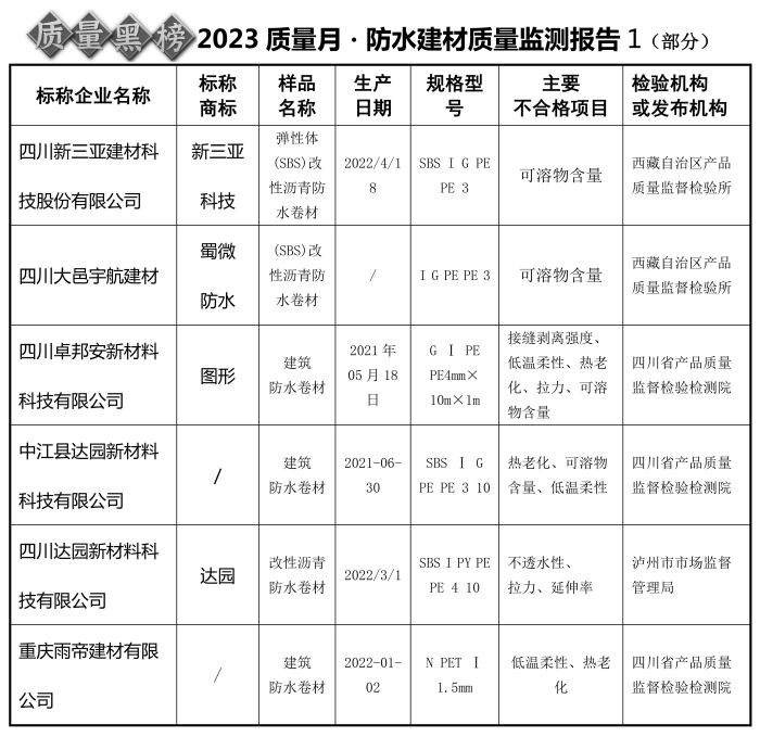 西藏自治区市场监督管理局今年发布的抽检数据显示,共抽查10个批次防水建材产品,其中3个批次防水建材不合格。抽产产品的产地涉及北京、广东、新疆、四川等地,产品标示的生产日期为2021年或2022年。抽检数据显示:标示为四川大邑宇航建材、四川新三亚建材科技股份有限公司等企业生产的防水建材样品经检测不合格,不合格项目为可溶物含量。