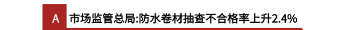 泸州市市场监督管理局今年发布的抽检数据显示,共抽查5个批次的弹性体改性沥青防水卷材,其中1个批次防水建材不合格,产品不合格率为20%。不合格项目为不透水性、拉力、延伸率项目不合格。